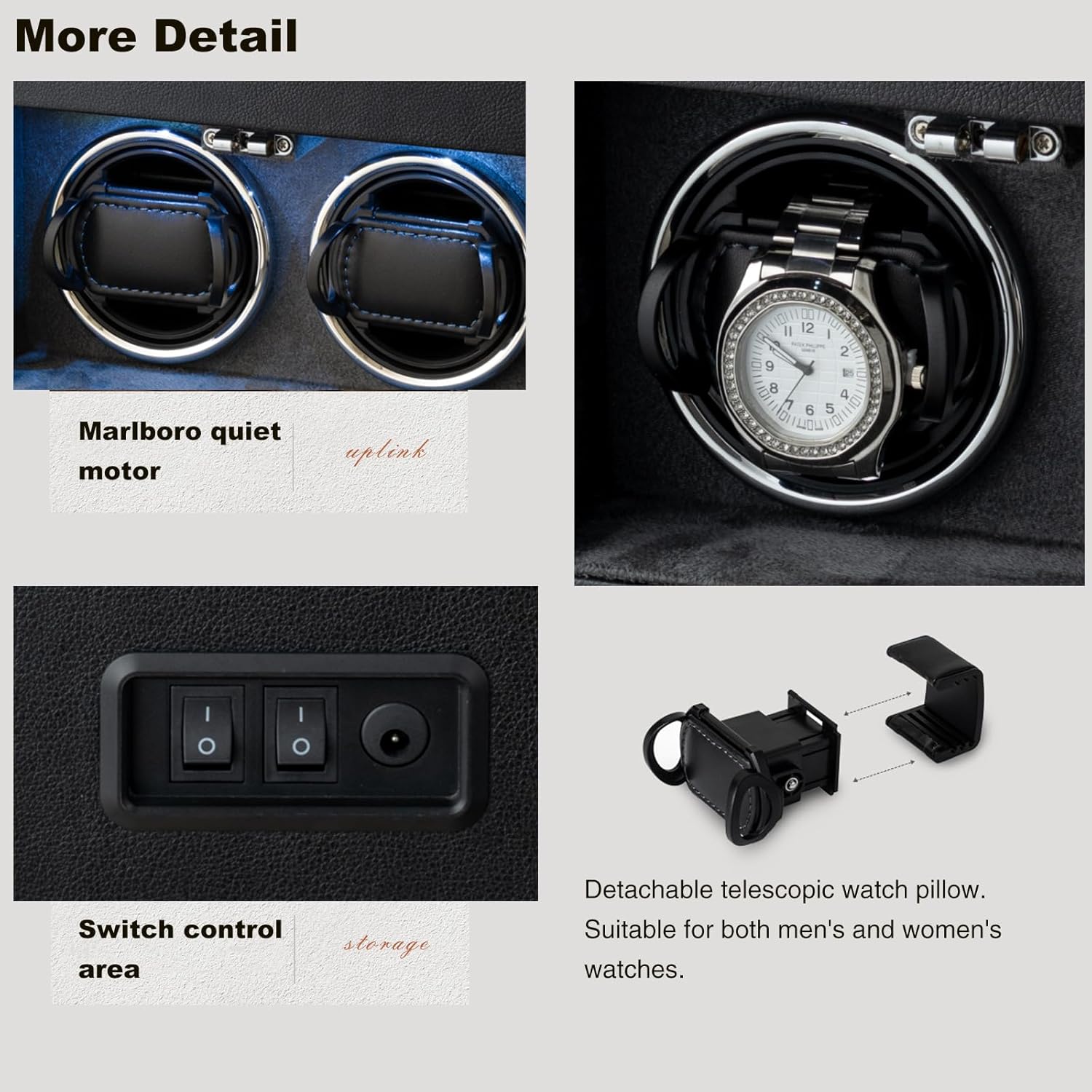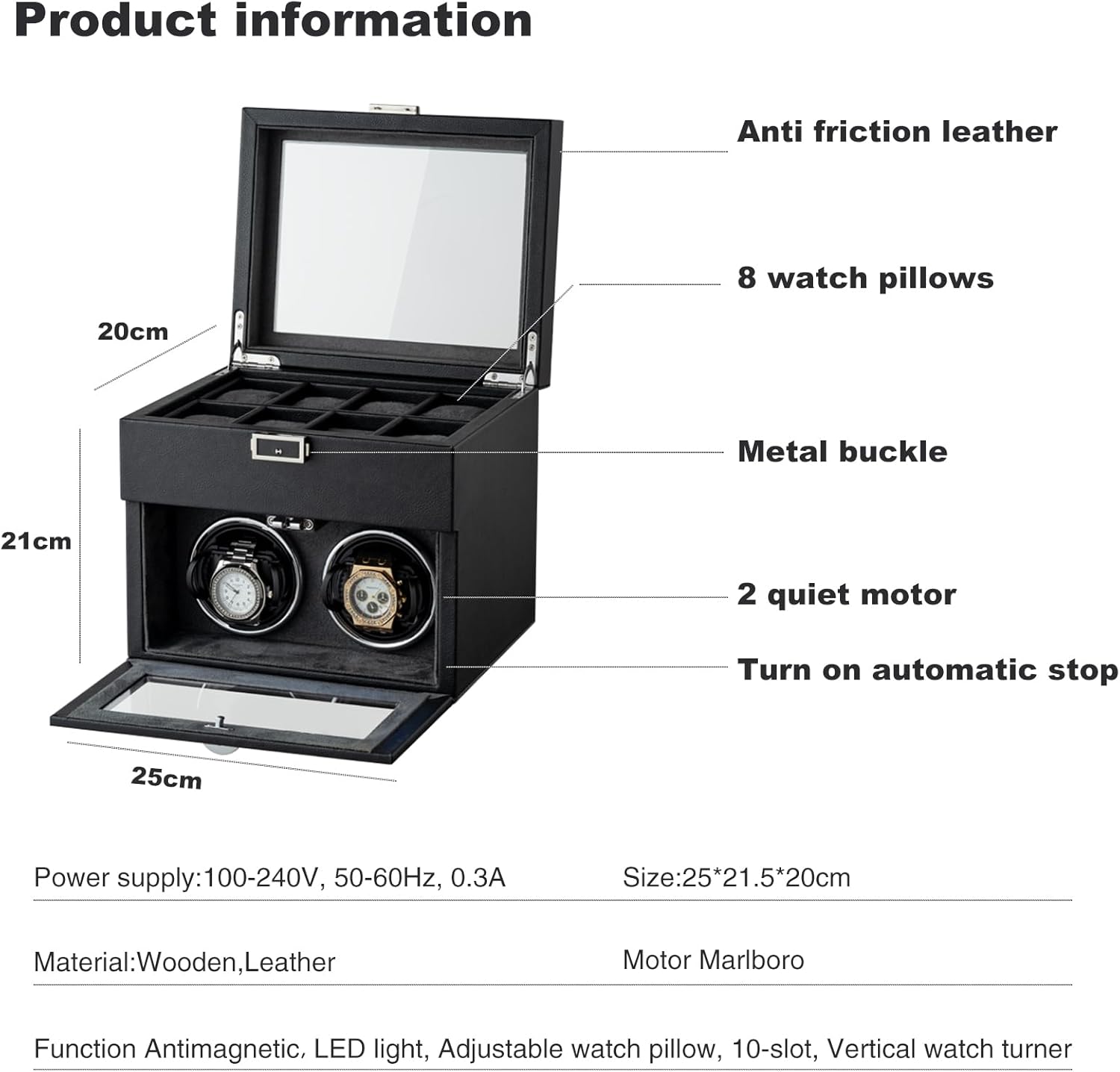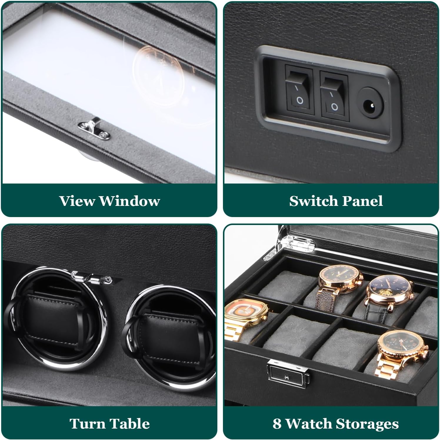 صندوق دوار تلقائي مزدوج للساعات - محرك هادئ، ضوء LED مع 8 فتحات وسائد قابلة للتعديل - منظم مجوهرات للرجال والنساء