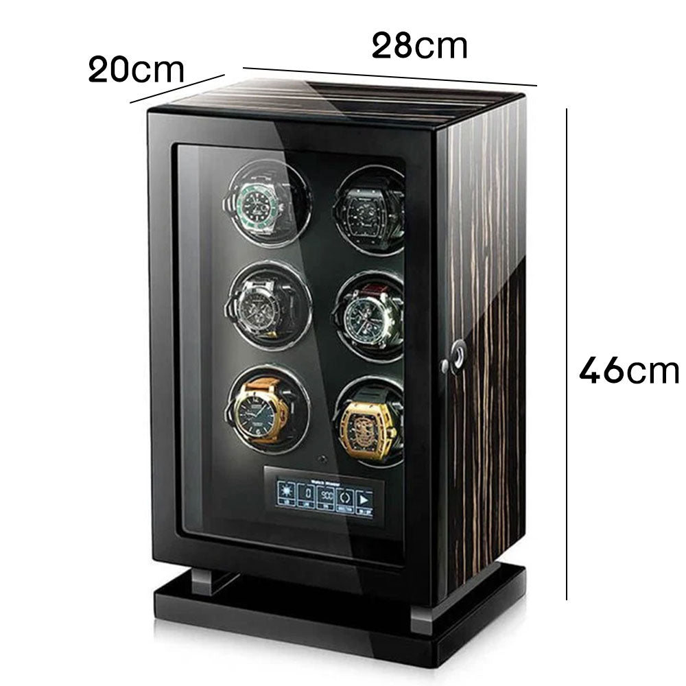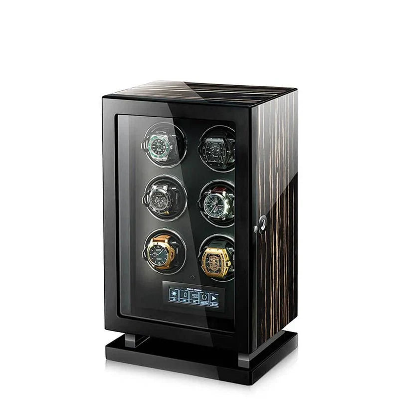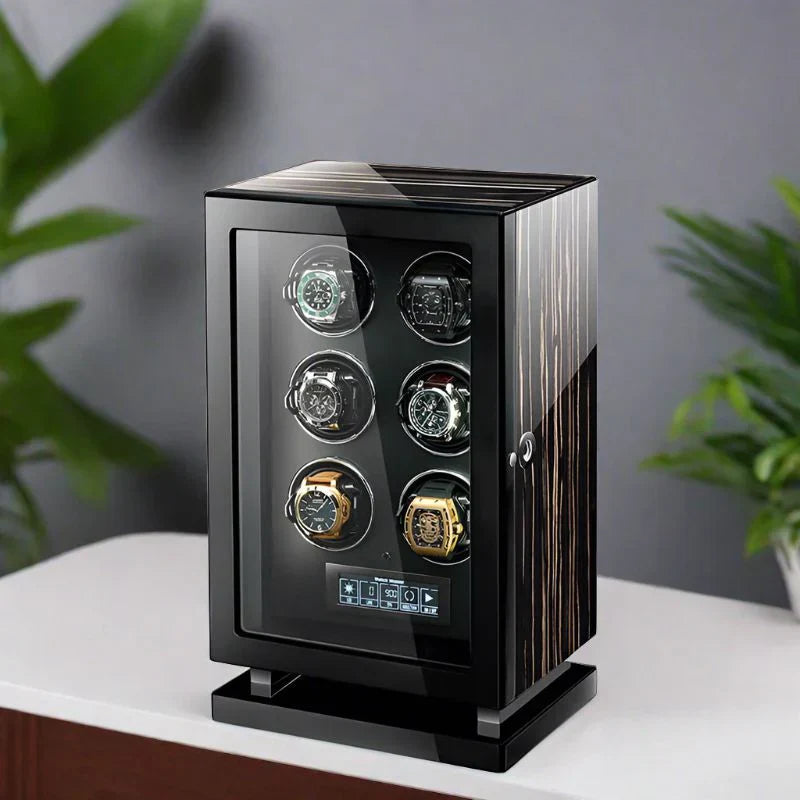 دلل ساعة مراقبتك في أحضان فاخرة من خلال جهاز لف الساعات الذكية Premium 6 الخاصة بنا، والذي يعمل بمحركات ألمانية ومزين بساعة من خشب الأبنوس زيبرانو - تحفة تحافظ على دقة الساعات بدقة ودقة.