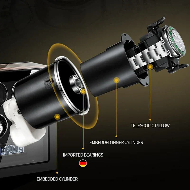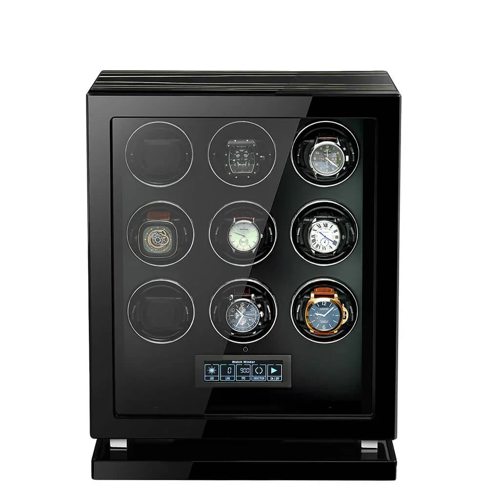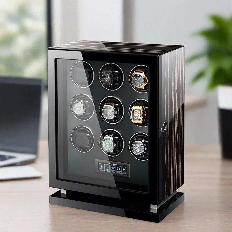 دلل ساعتك الأوتوماتيكية في أحضان فاخرة من خلال جهاز لف الساعات Premium 9 الخاص بنا، والذي يعمل بمحركات ألمانية ومزين بورنيش البيانو من خشب الأبنوس Zebrano - تحفة فنية تحافظ على دقات الساعات بأناقة ودقة.
