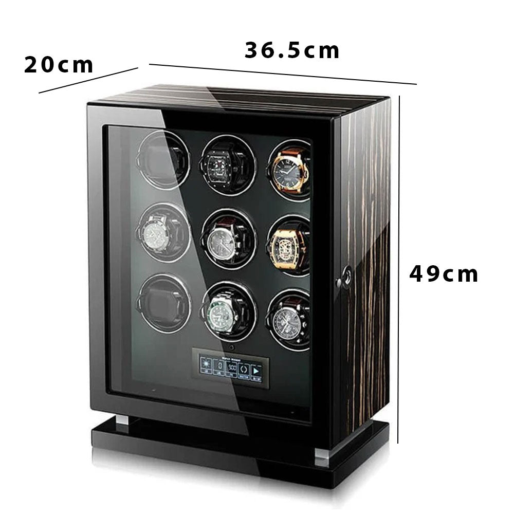 صندوق لف الساعات التلقائي الفاخر 9 ساعات من خشب الأبنوس المزخرف بورنيش البيانو من M&Q جيرمن ماشينيري مع ريموت تحكم وبصمة الأصبع لفتح الصندوق