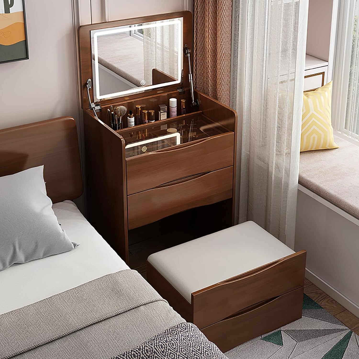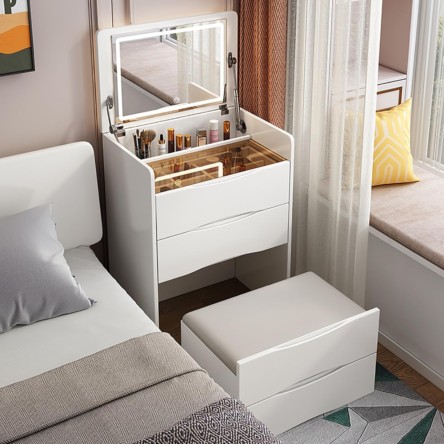 طاولة تزيين BAYTEWJX مع أضواء وطاولة زينة لغرفة النوم ومرآة بثلاثة ألوان إضاءة قابلة للتعديل مع مقعد مبطن ودرجين مع لوحة عرض من الزجاج المقسّى للمساحات الصغيرة. 48 سم