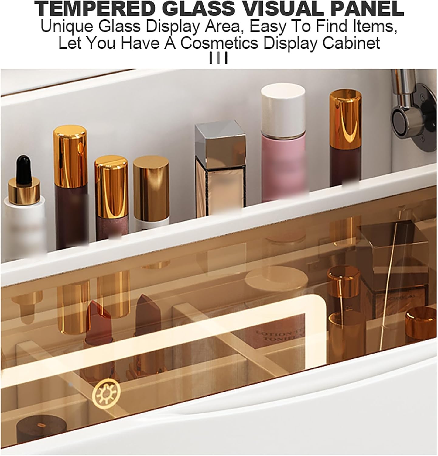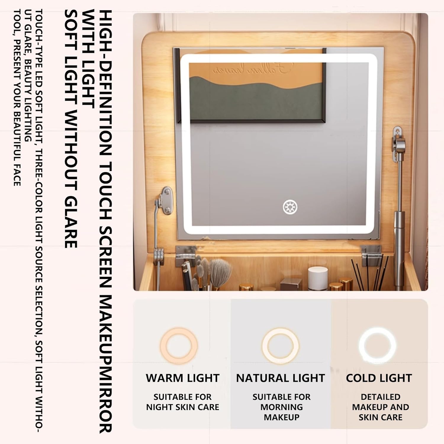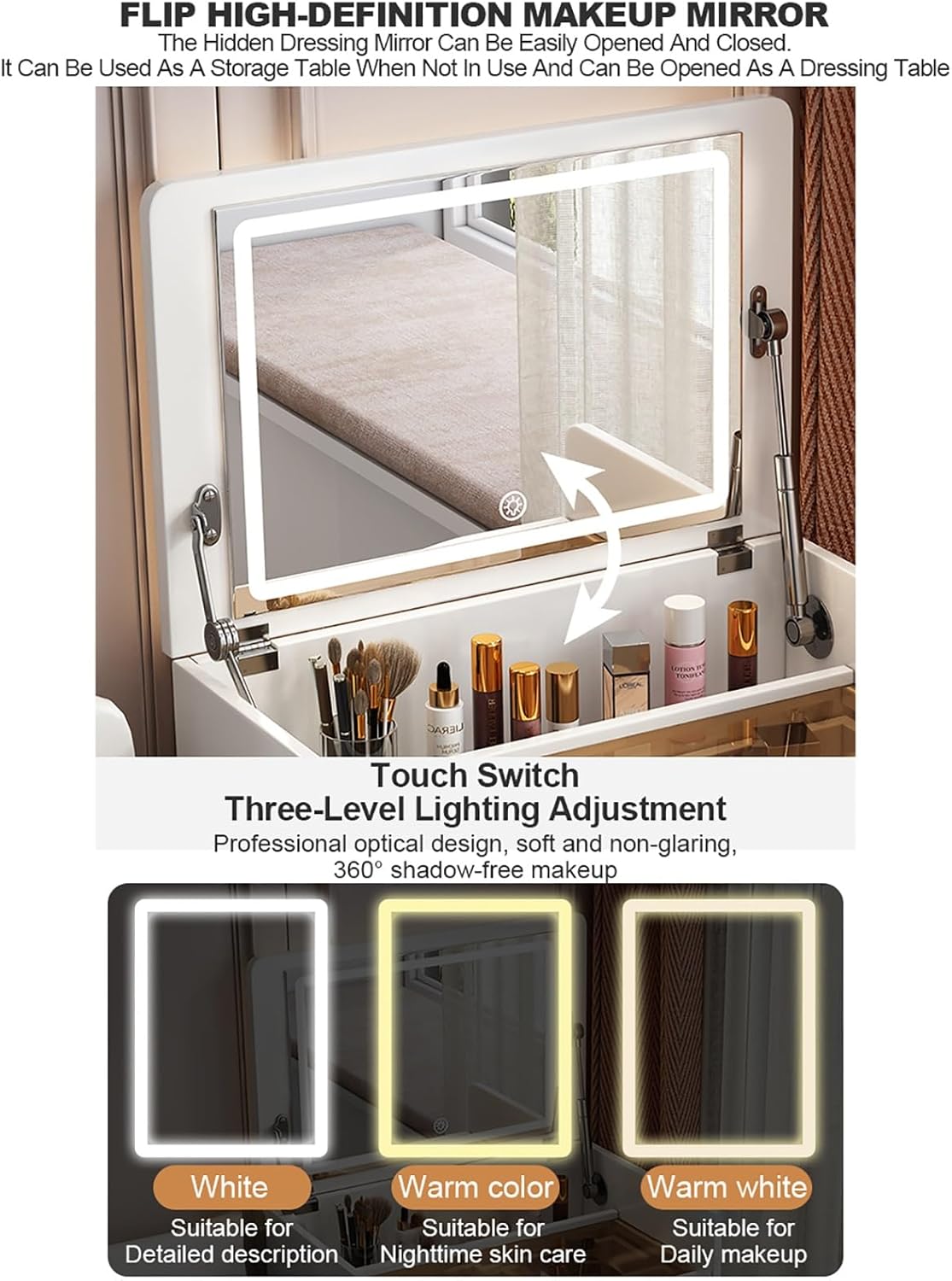 1. 【تصميم ذكي】: تتميز هذه الطاولة العصرية المتكاملة مع مرآة مضيئة قابلة للطي بمرآة ذكية مع ضوء LED ثلاثي الألوان، مما يسمح بتطبيق مكياج دقيق وخالٍ من العيوب في أي وقت وفي أي مكان.