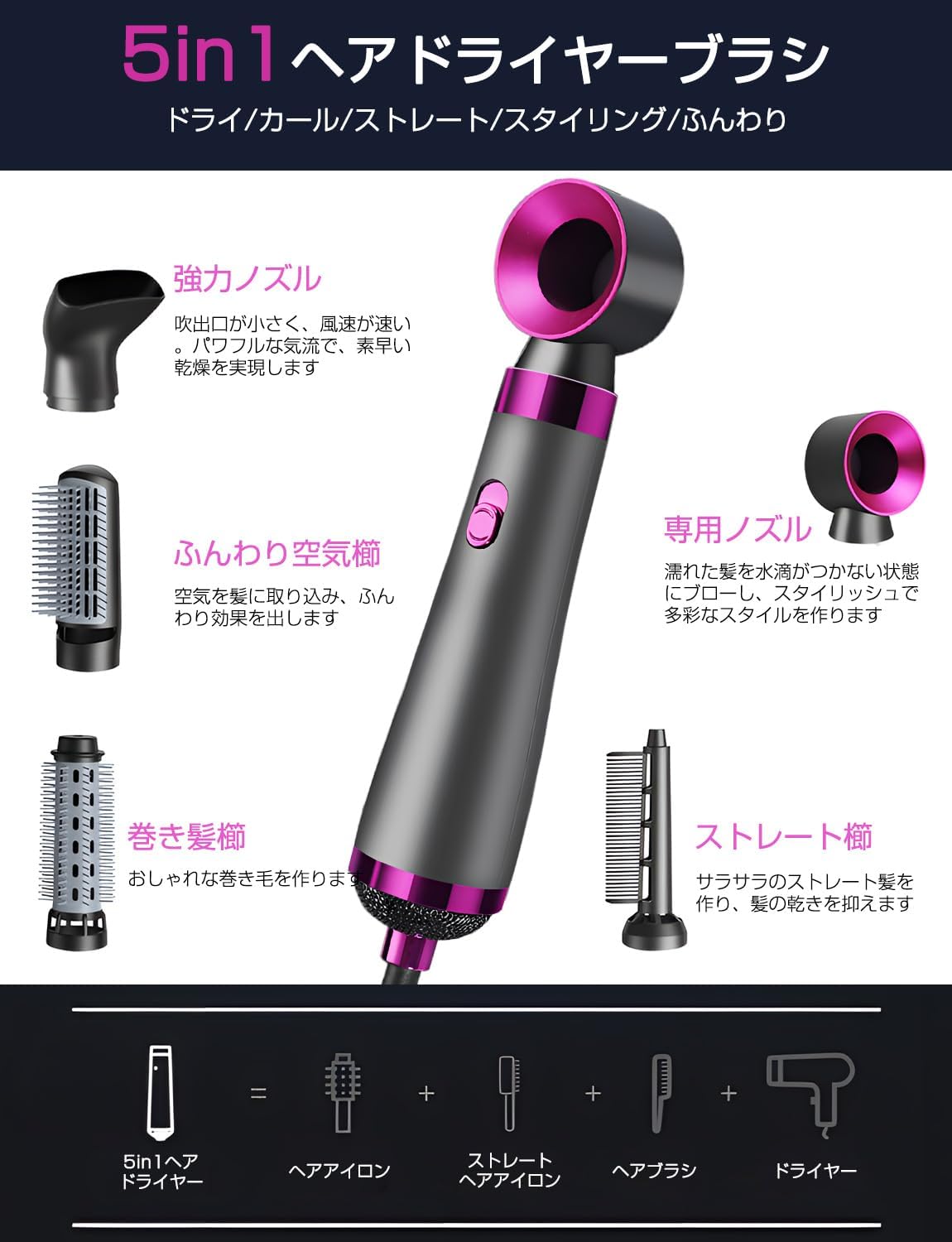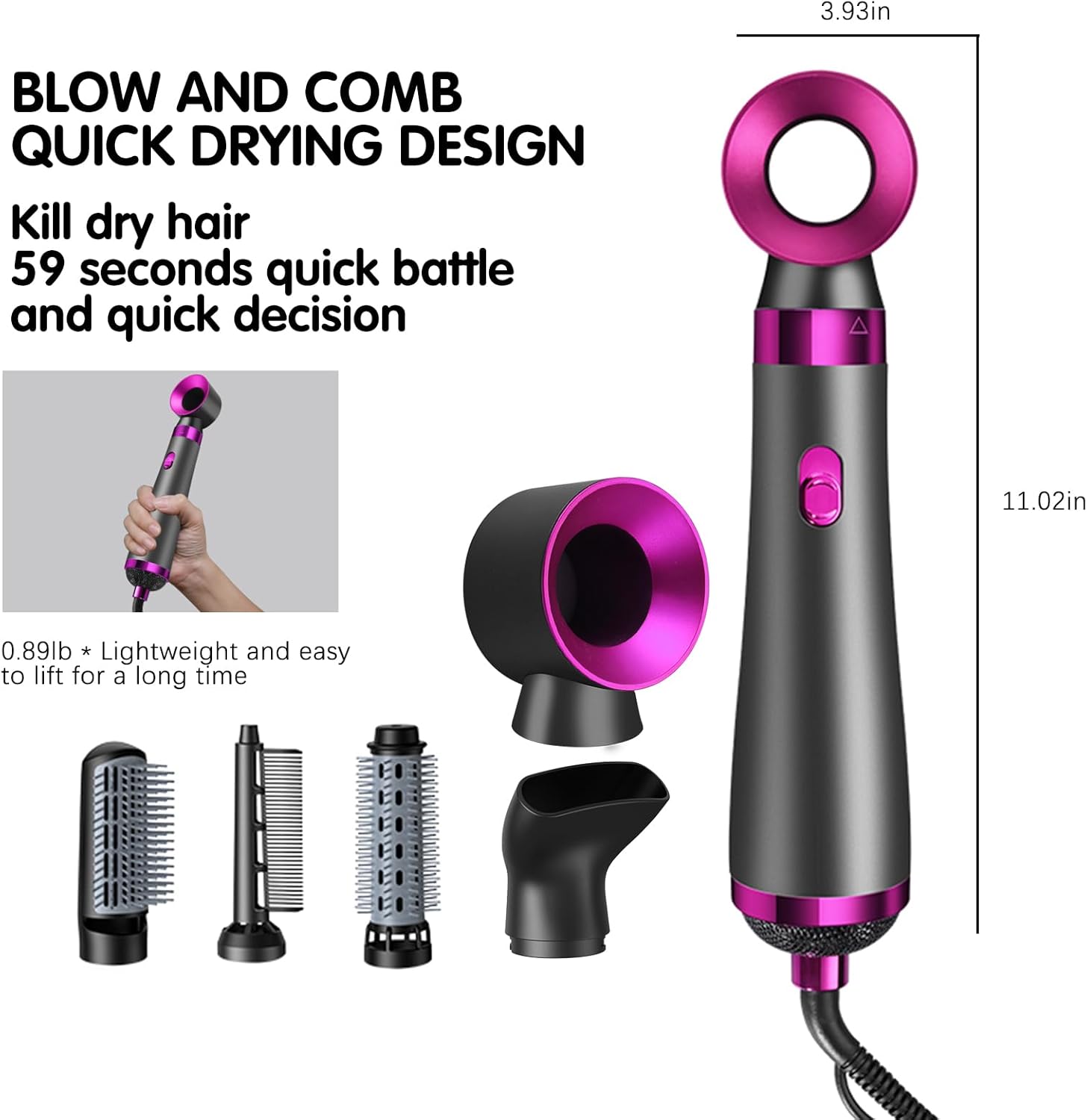 - 【أداة تصفيف الشعر ومجفف الشعر 5 في 1】يحتوي هذا المجفف على 5 قطع غيار. يحتوي الرأس على تصفيف مجوف وفم تجميع للرياح ومشط تجعيد ومشط نصف دائري ومشط مستقيم. جفف وتجعيد وفرد وتصفيف. اصنع تسريحة صالون بسهولة في المنزل. ملاحظة: هيكل المشط صلب نسبيًا، لذا فإن أولئك الذين لديهم فروة رأس ضعيفة سيشترون بعناية.