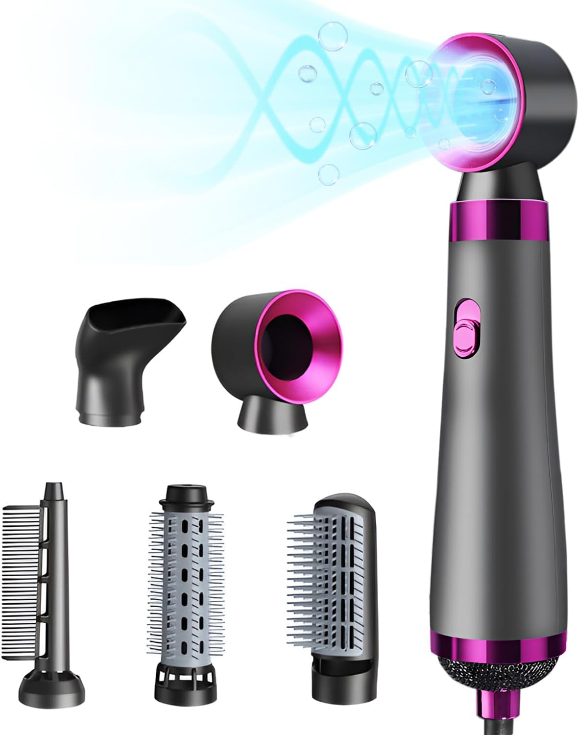 مجفف الشعر ، تدفق هواء كبير، تجفيف سريع، مجفف شعر، 1200 واط، مجفف تجعيد الشعر، 3 مستويات لضبط حجم الهواء البارد والساخن، مجفف أسطواني، أيونات سالبة، 5 ملحقات، منع ارتفاع درجة الحرارة