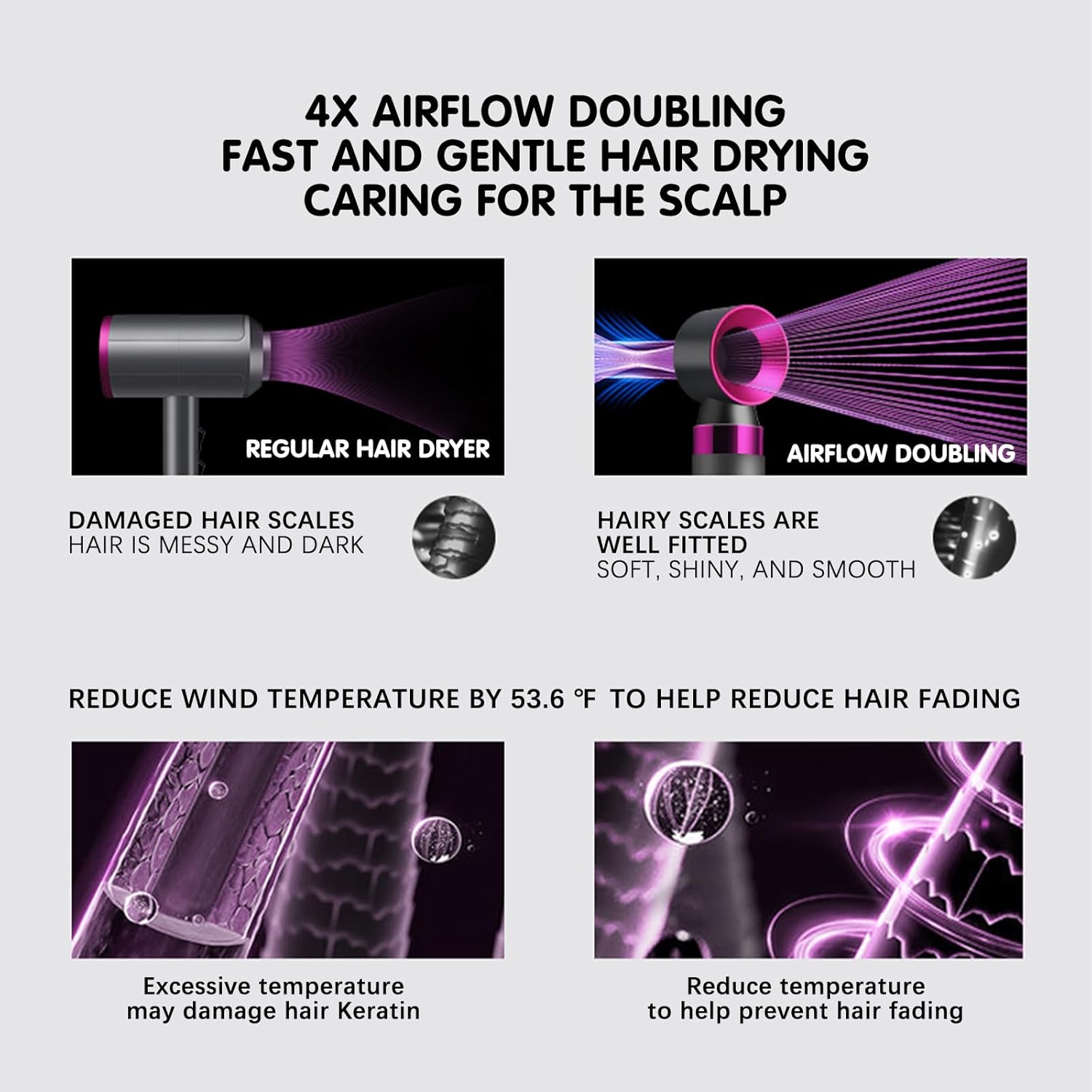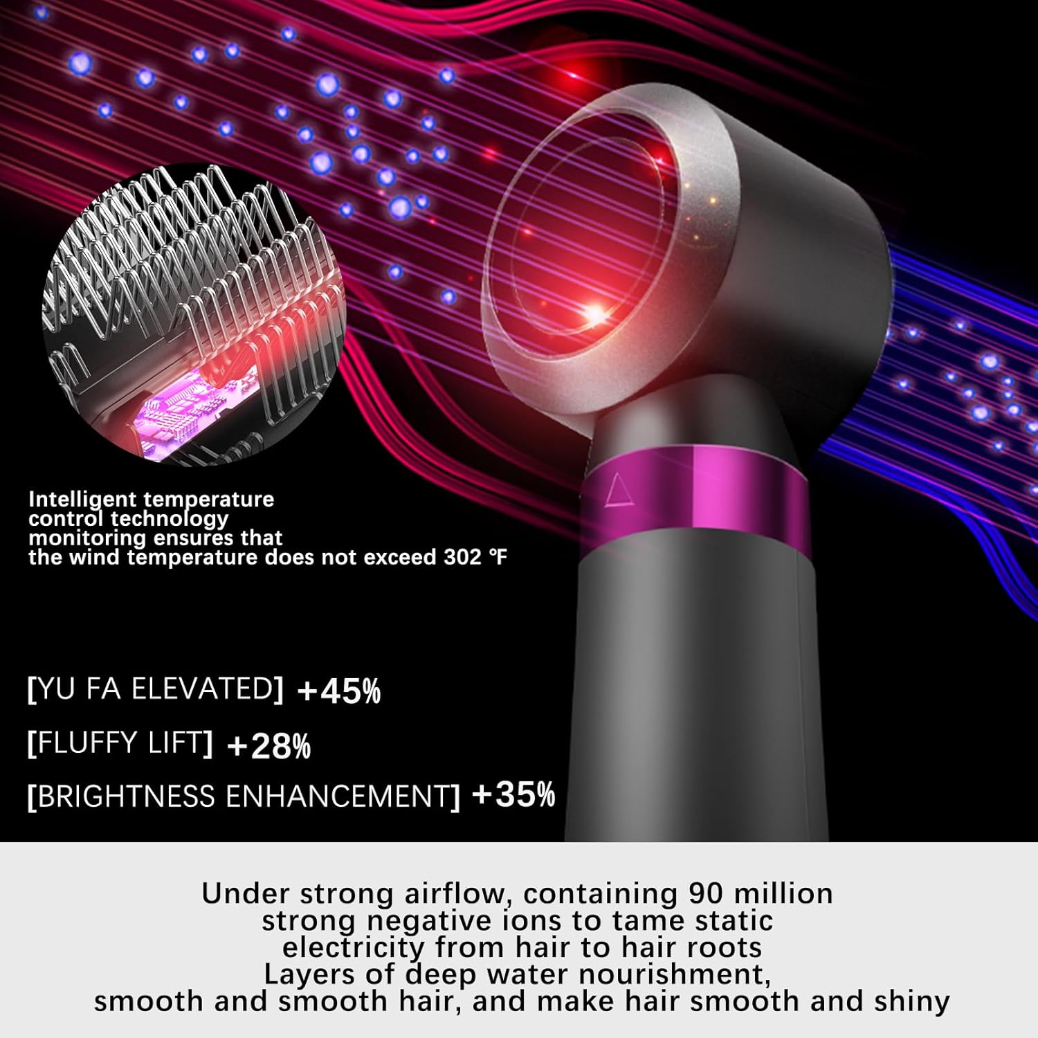- الأيونات السالبة و4 أنظمة حماية ذكية كبيرة: يحتوي مجفف الشعر هذا على تركيز عالٍ من أجهزة الأيونات السالبة التي يمكنها إطلاق كمية كبيرة من الأيونات السالبة لحماية الكهرباء الساكنة من الشعر إلى الجذور. يحتوي على 4 أنظمة حماية ذكية كبيرة: نظام التحكم الذكي في درجة الحرارة (58 مرة في الثانية للتحكم الدقيق في درجة الحرارة لمنع تلف الحرارة الزائدة)، شريحة حماية الدائرة من الحرارة الزائدة (درجة حرارة الجهاز مرتفعة للغاية وتتوقف إمداد الطاقة على الفور)، تقلل الإشعاع الكهرومغناطيسي (تمنع خطر الإشعاع)، قلب سلك نحاسي نقي مختار (ضمان السلامة)