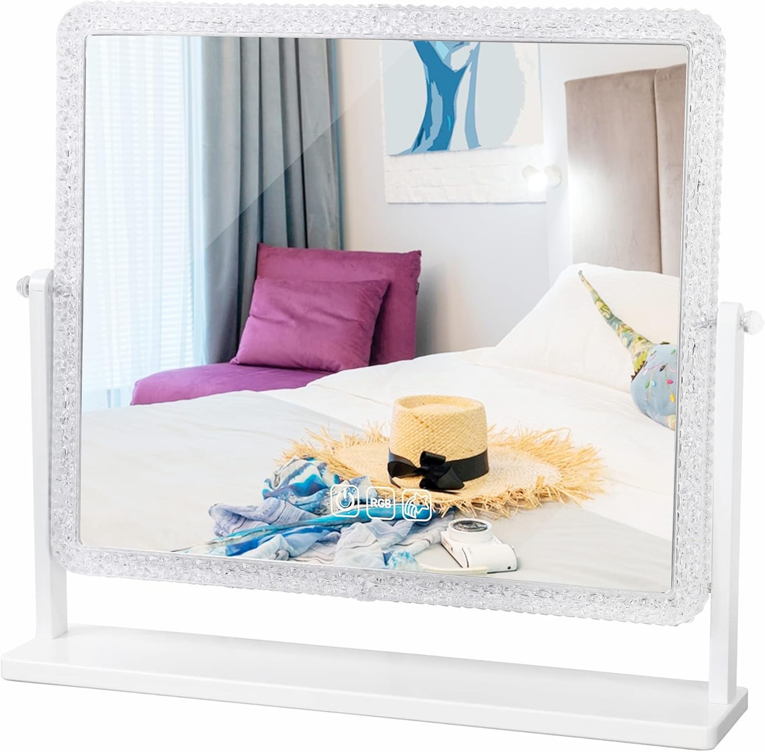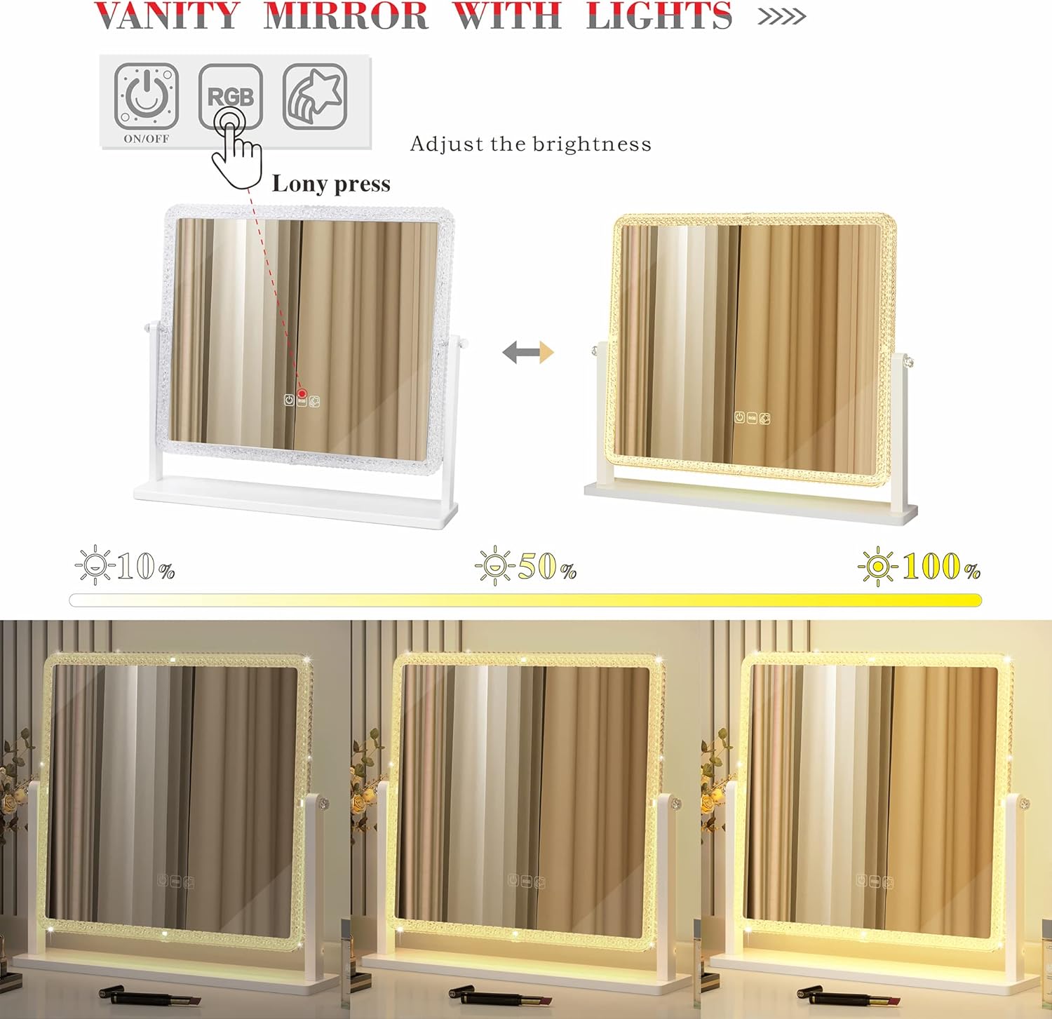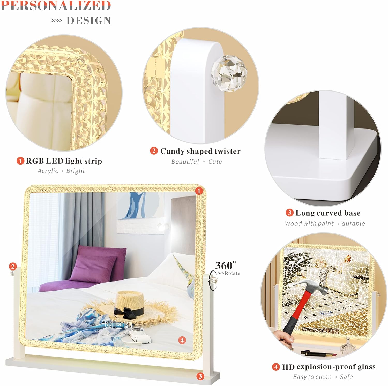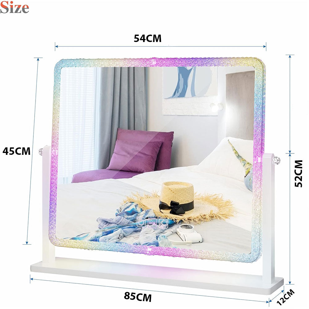 مرآة زينة مع أضواء، مرآة مكياج 54 سم × 45 سم بألوان RGB و14 وضعًا قابلة للتعتيم، مرآة مكتب بيضاء، مرآة مضاءة LED لامعة، مرآة زينة تعمل باللمس للتحكم في غرفة النوم وتدعم الشحن اللاسكلي
