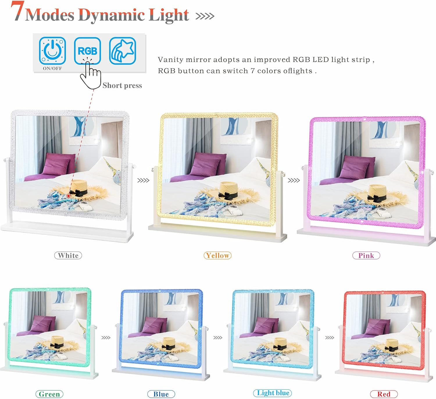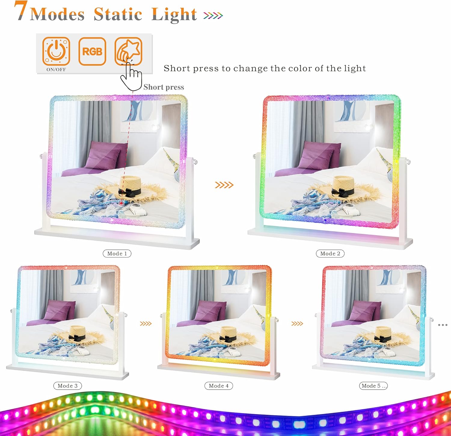 🌸【7 أضواء وضع ثابت】تتبنى مرآة الزينة هذه شريط إضاءة LED RGB محسّن، يمكن لزر RGB تبديل 7 ألوان من الأضواء، والضغط لفترة طويلة على الزر يمكن ضبط السطوع بين هذه الألوان لتلبية متطلبات المكياج الشخصية الخاصة بك. (أبيض، أزرق فاتح، وردي، أحمر، أصفر، أزرق، أخضر)