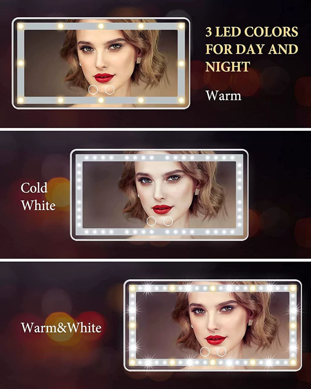 3 ، تصميم شاشة تعمل باللمس: تحتوي مرآة الغرور في السيارة على مستشعرين تعمل باللمس لتتمكن من التبديل بين وضعي الإضاءة الأبيض البارد والأصفر الدافئ. واضغط لفترة طويلة لضبط سطوع الأضواء.