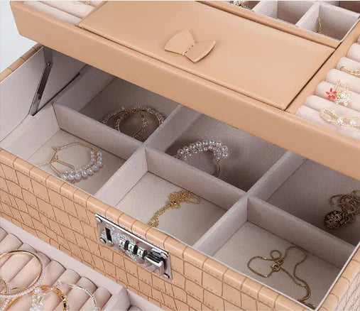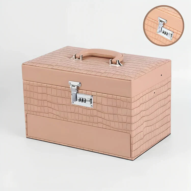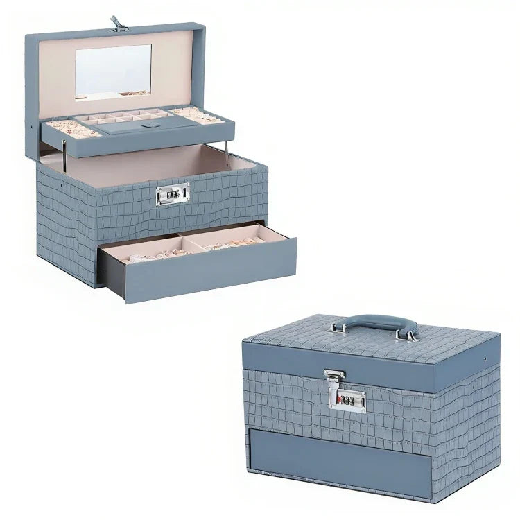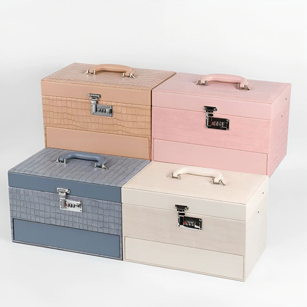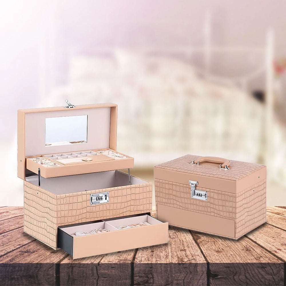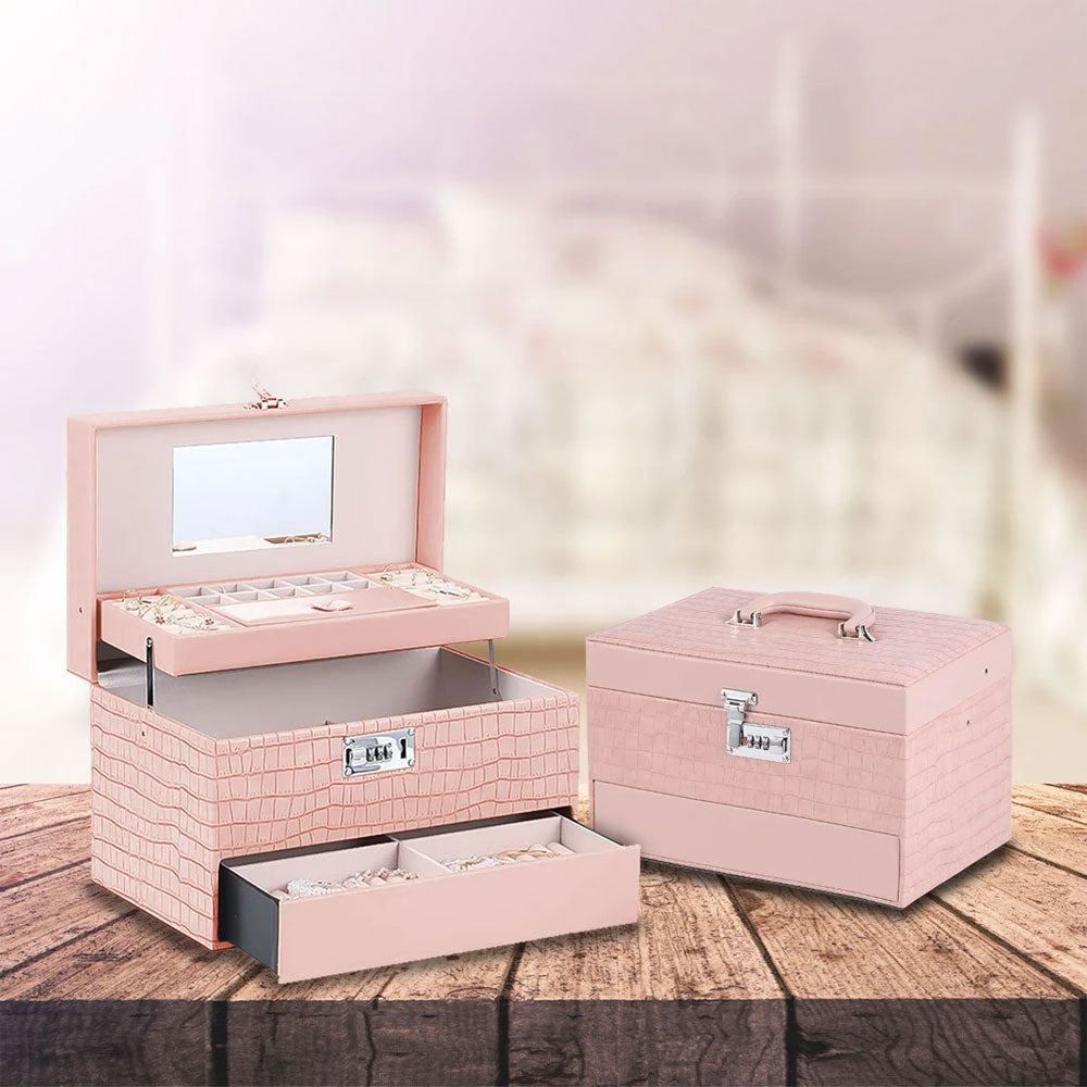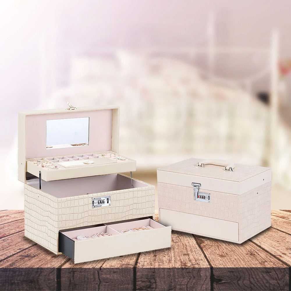 متجر LC أوف وايت جلد التمساح نمط جلد صناعي 3 طبقة قابلة للتحويل حلية مجوهرات منظم صندوق تخزين مع قفل قفل الهدايا