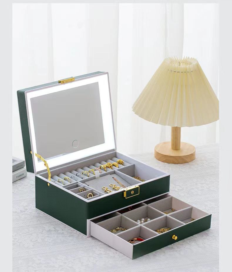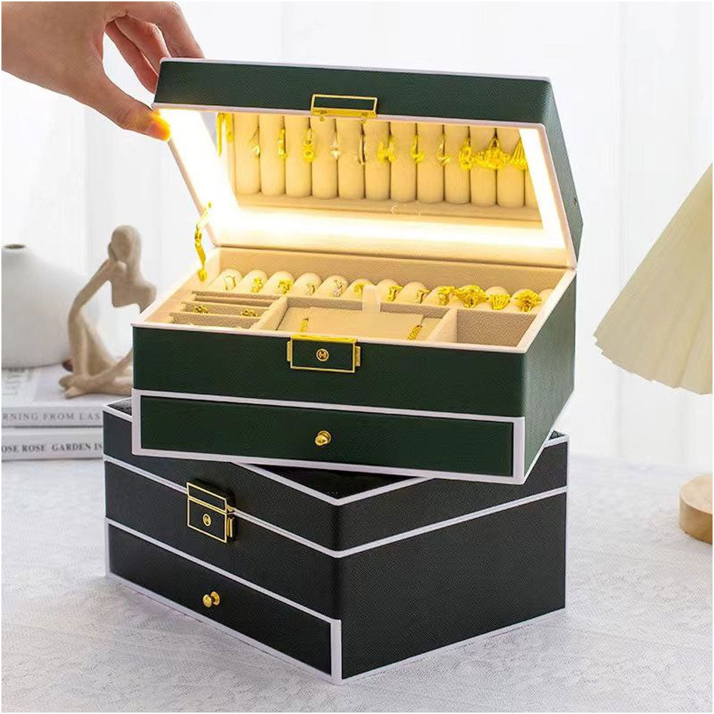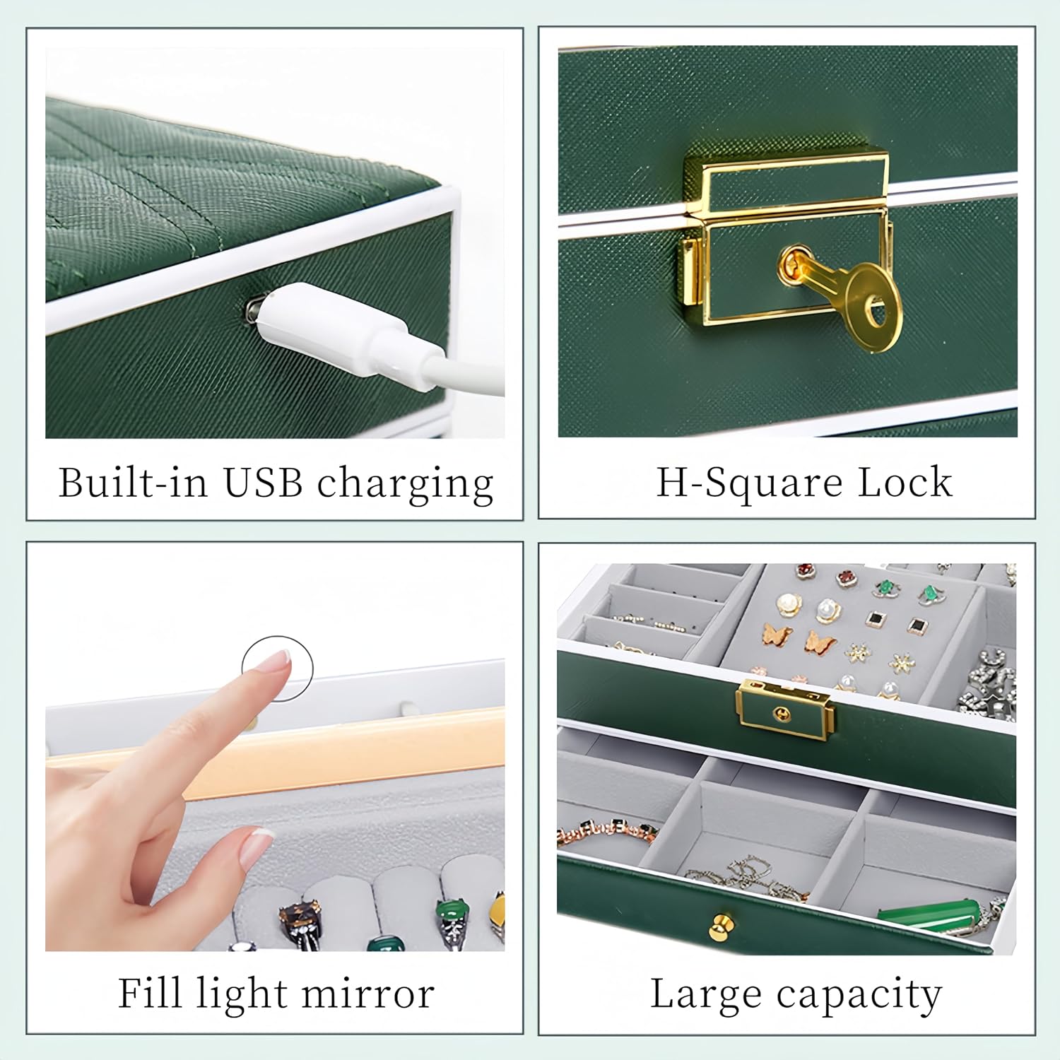 صندوق مجوهرات نسائي منظم مجوهرات بطبقتين، منظم حديث مع مرآة و3 مصابيح LED ملونة، مناسب للخواتم والأقراط والقلائد والأساور