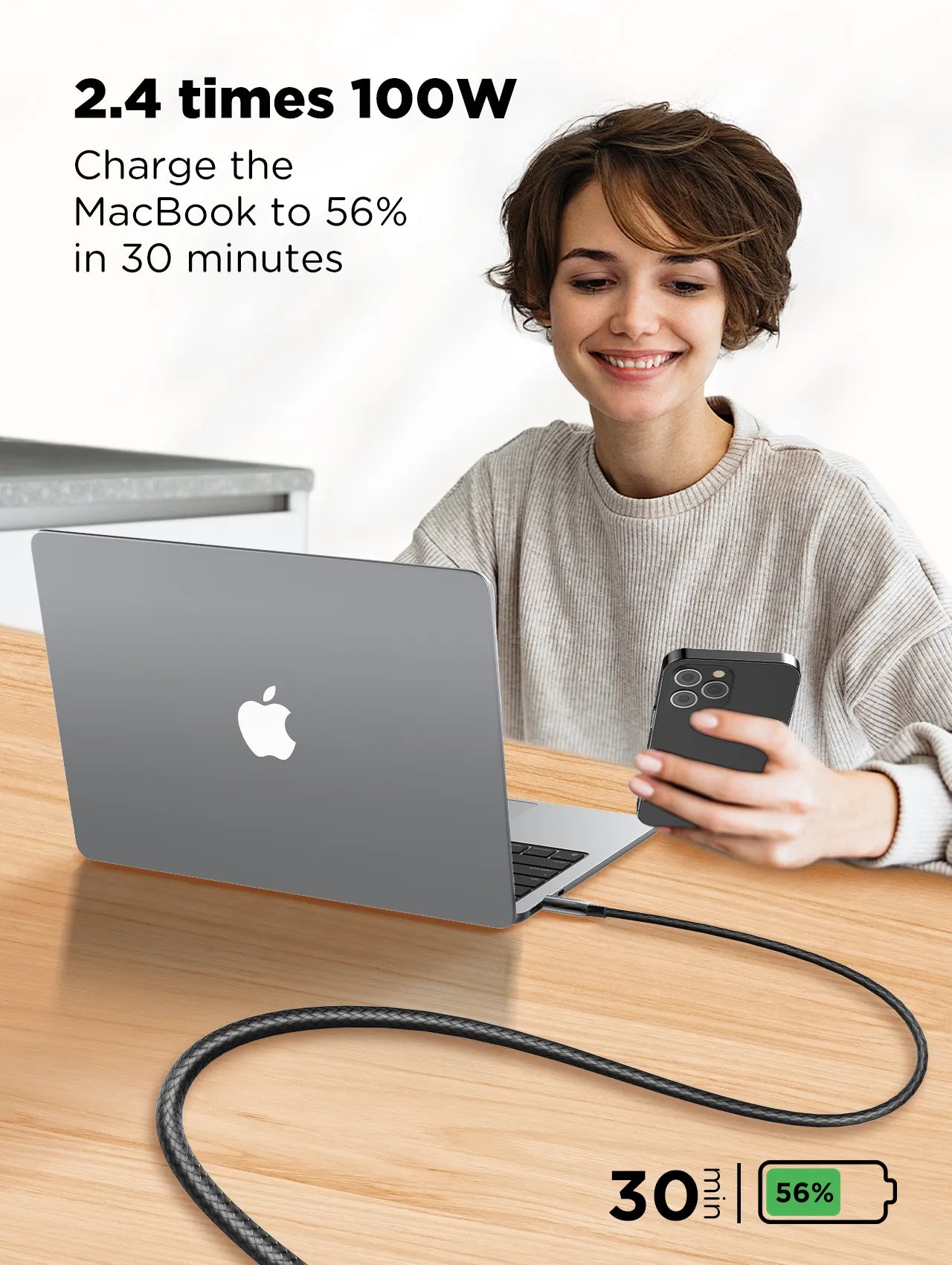 شحن سريع عالي الطاقة بقوة 240 وات، يحدد جهاز الشحن بذكاء، والذي يمكنه الشحن السريع ونقل البيانات للأجهزة مثل الهواتف الذكية والأجهزة اللوحية التي تدعم الشحن السريع.