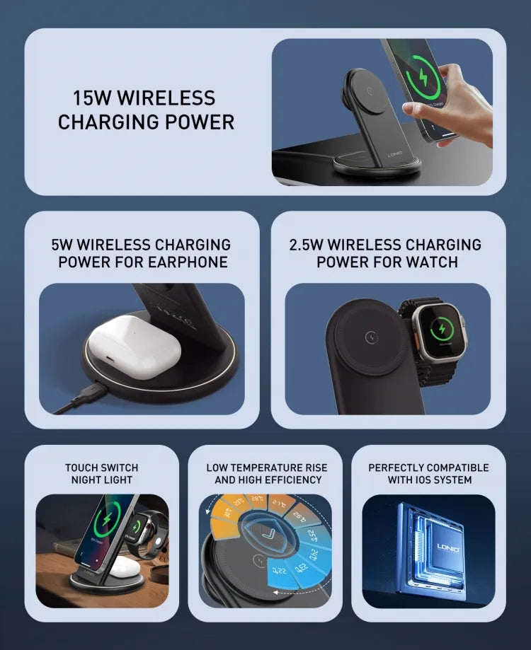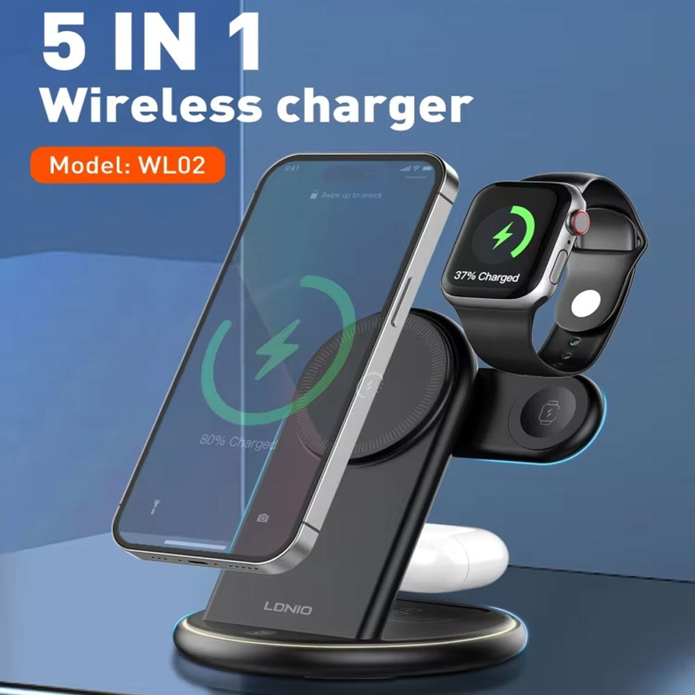 LDNIO WL02 محطة شحن سريعة 15 وات متعددة الوظائف 5 4 3 في 1 حامل واحد لهاتف iPhone 15 14 13 pro max
