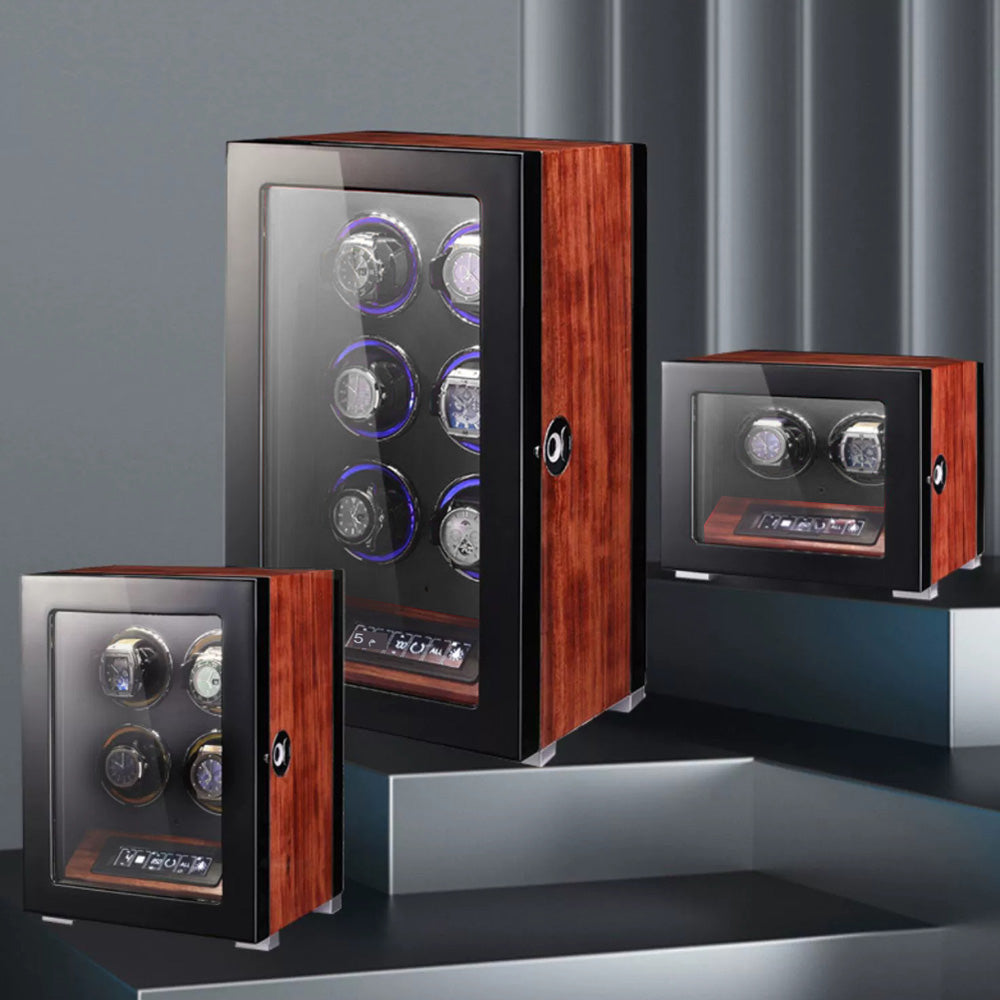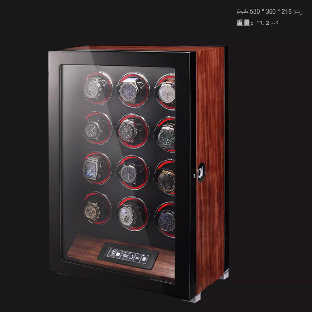 علبة لف ساعات فاخرة متعددة – تصميم فاخر بتشطيب خشبي أحمر مع شاشة لمس LCD وإضاءة LED