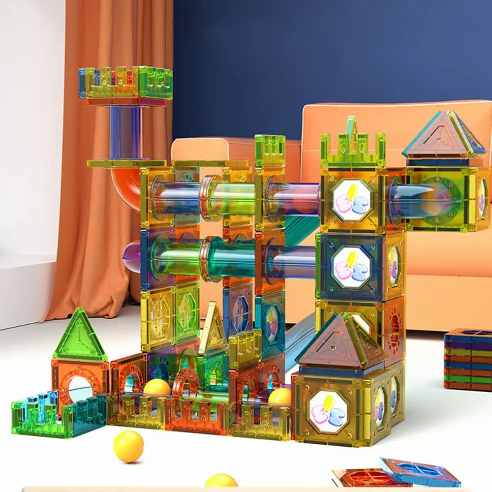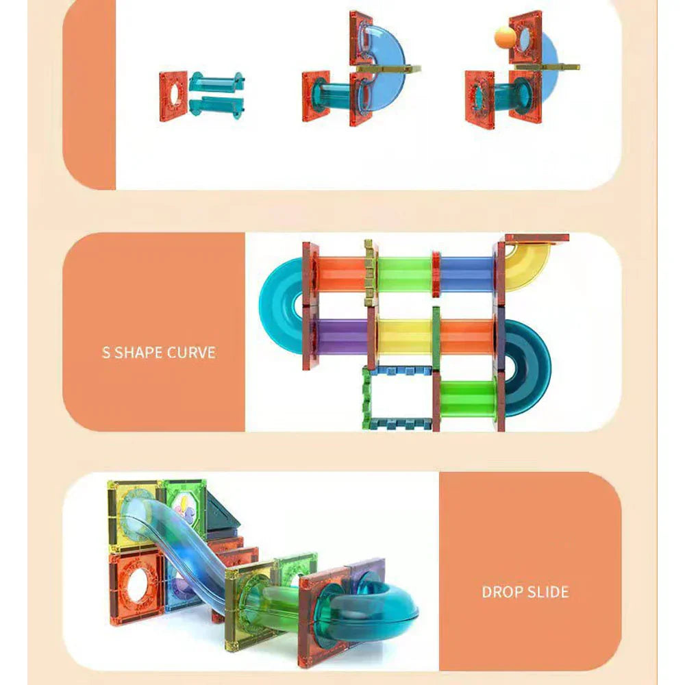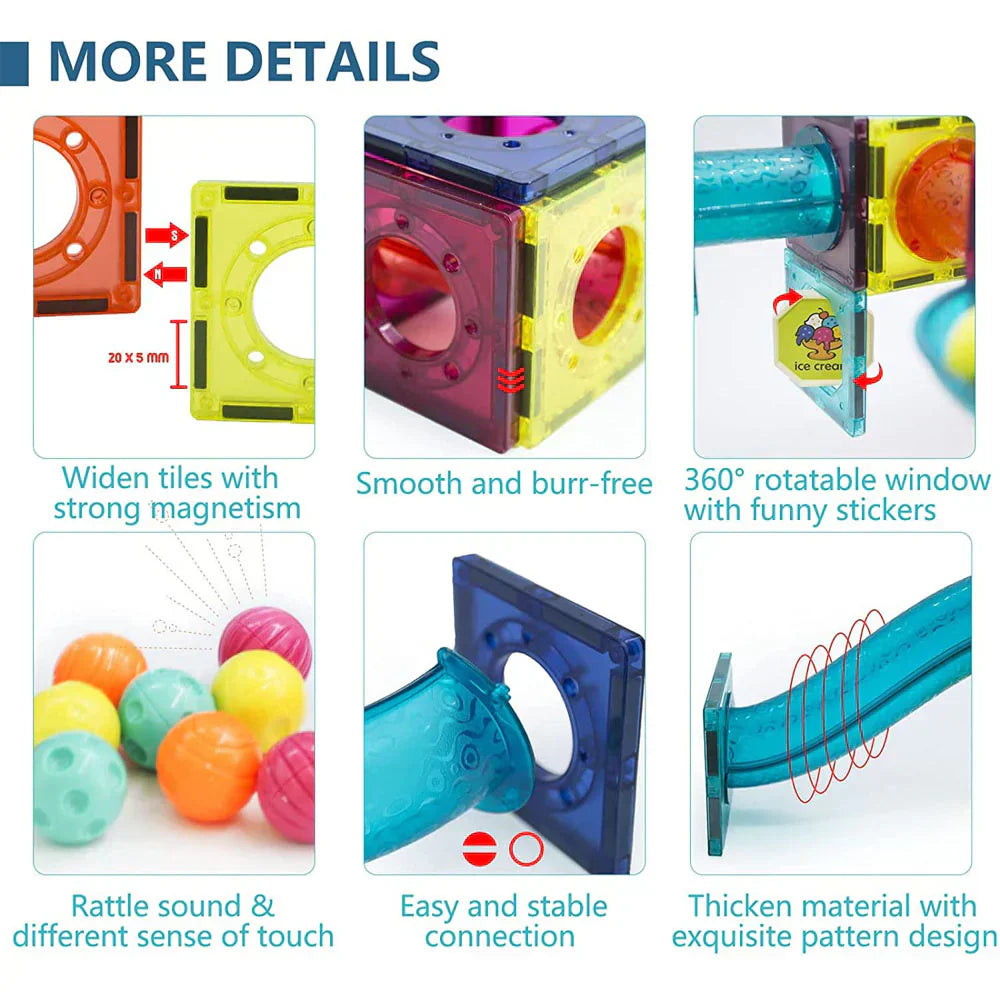 متعة بناء لا نهاية لها: تتضمن مجموعة الجري الرخامية المغناطيسية المطورة بلاطًا مغناطيسيًا شفافًا نابضًا بالحياة وملونة، وخطوط أنابيب، وكرات متوهجة، وملصقات لطيفة. يمكن للأطفال البناء في أشكال ثنائية الأبعاد/ثلاثية الأبعاد وفقًا لخيالهم، واستكشاف إمكانيات لا حصر لها.