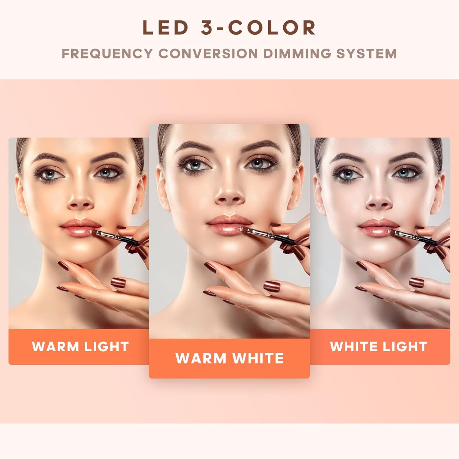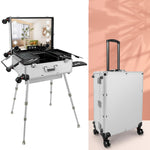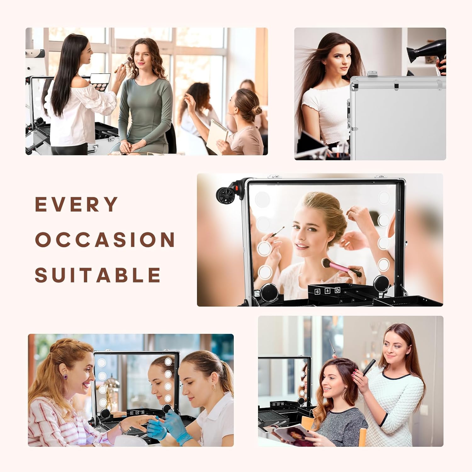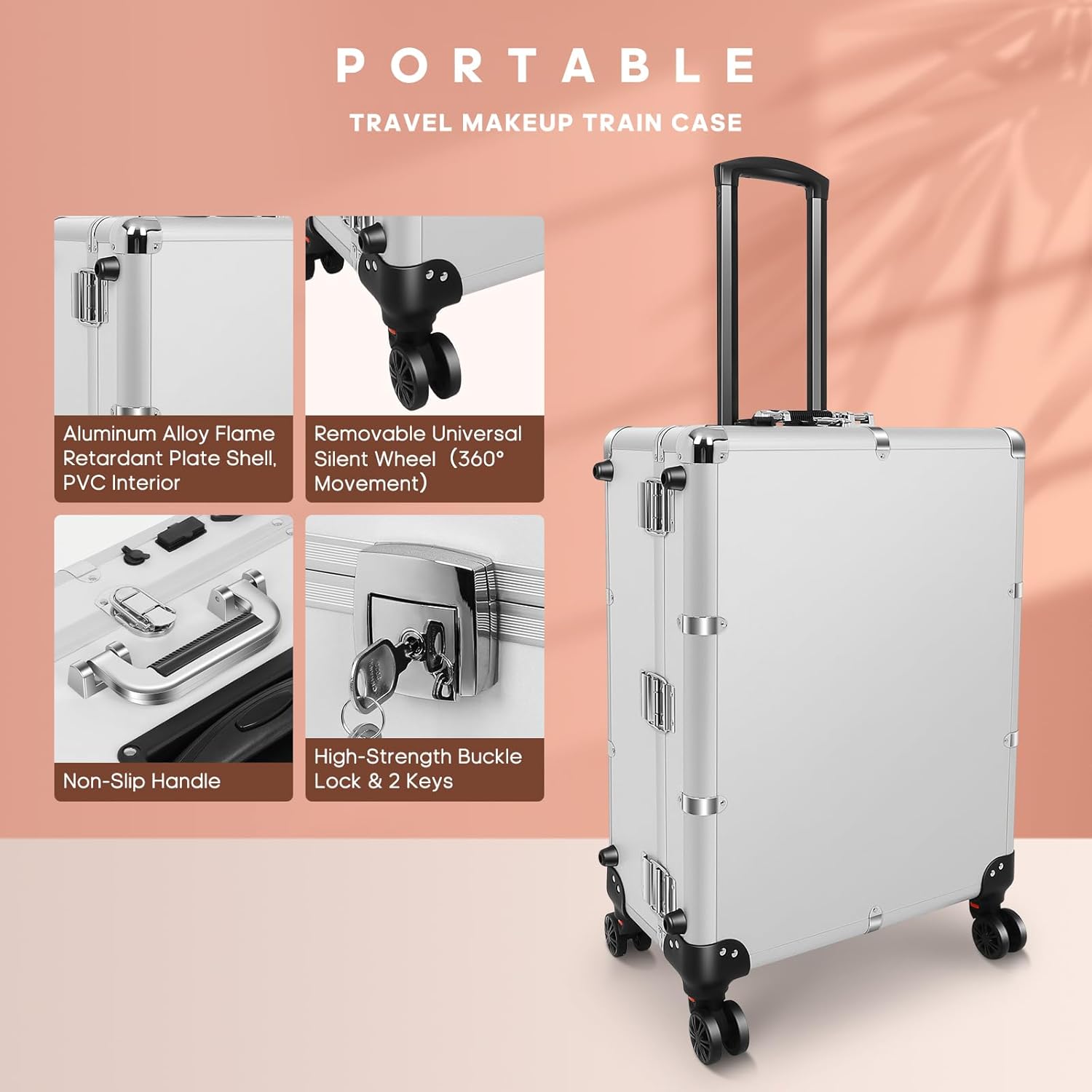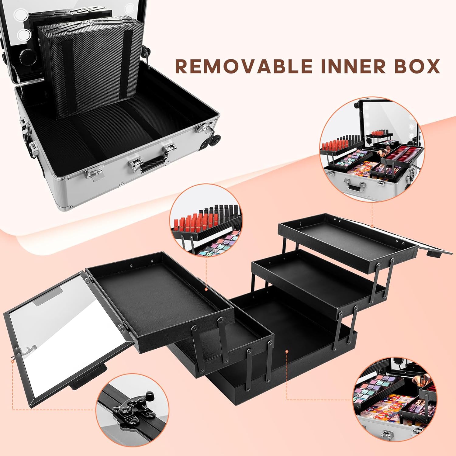 حقيبة مستحضرات تجميل من الألومنيوم مزودة بإضاءة LED، منظم مكياج احترافي 24 بوصة مع حامل مكبر صوت، محطة مكياج مضيئة متدحرجة، 3 درجات إضاءة (فضي)