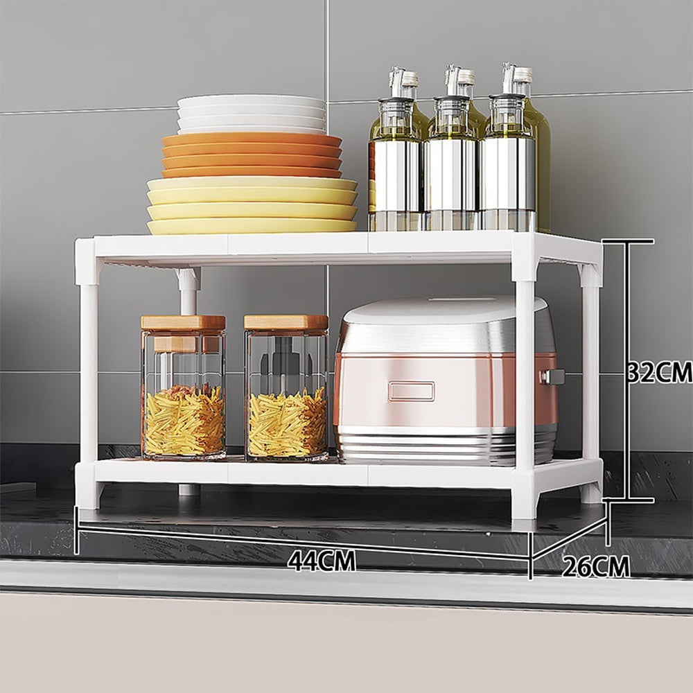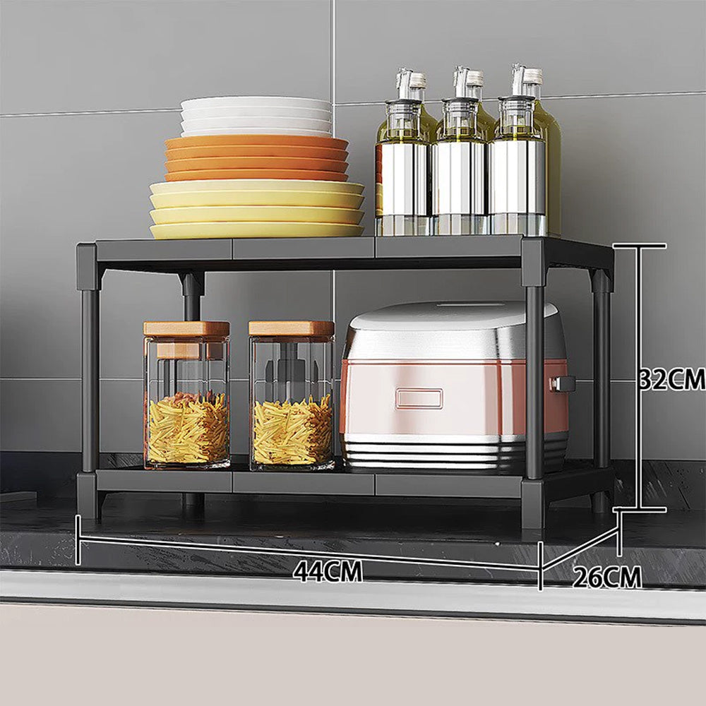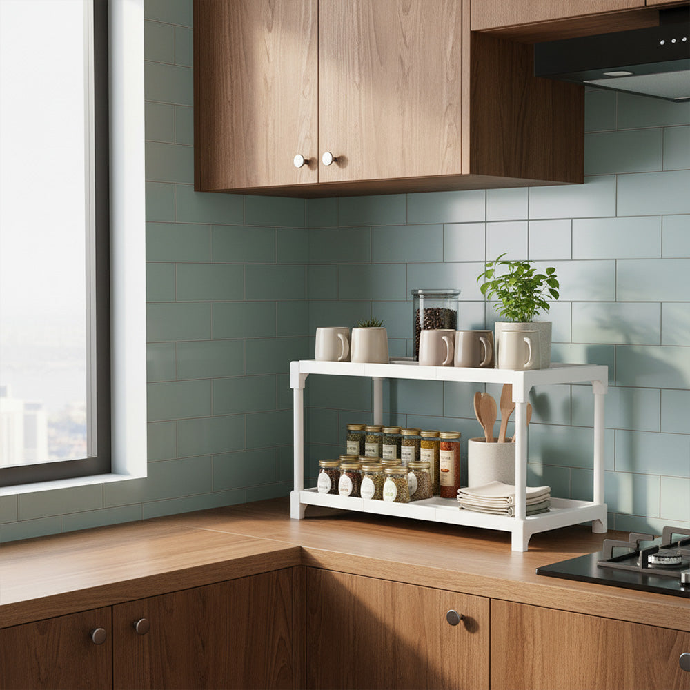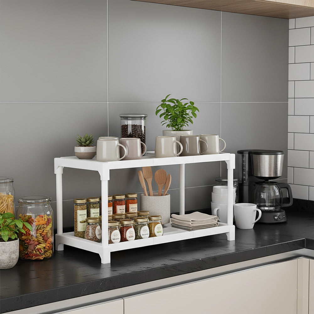 استفد من مساحة مطبخك مع هذا الرف المتين ذو الطبقتين. مصمم بإطار مدمج 44×26×32 سم، يُتيح لك تخزين الأطباق والتوابل والأجهزة الصغيرة بشكل مثالي، مع الحفاظ على نظافة طاولتك وسهولة الوصول إليها. متوفر باللونين الأبيض والأسود.