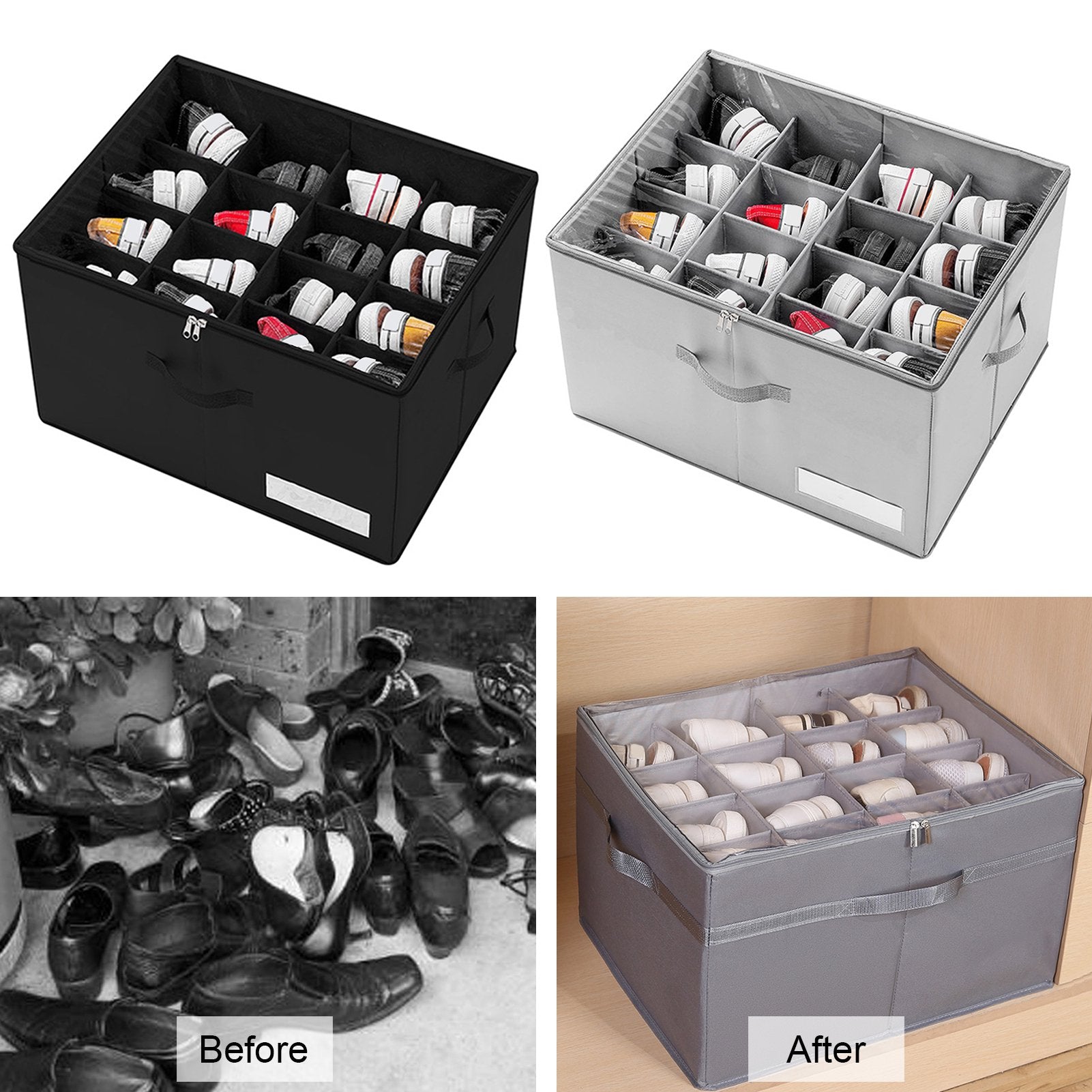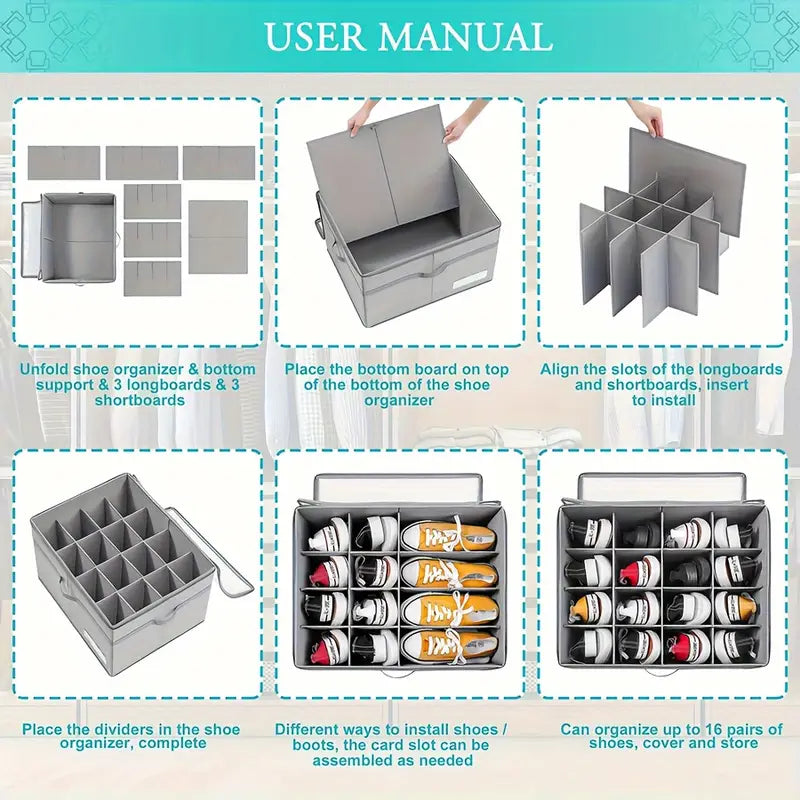 منظم أحذية بـ 16 زوجًا،   قابل للطي من قماش تخزين الأحذية بقاعدة داعمة، صناديق أحذية مستطيلة كبيرة، مقاومة للماء، إغلاق بواسطة الضغط، حامل أحذية موفر للمساحة بمقابض معززة، رمادي، أثاث خزانة متعدد الاستخدامات التفاصيل 0