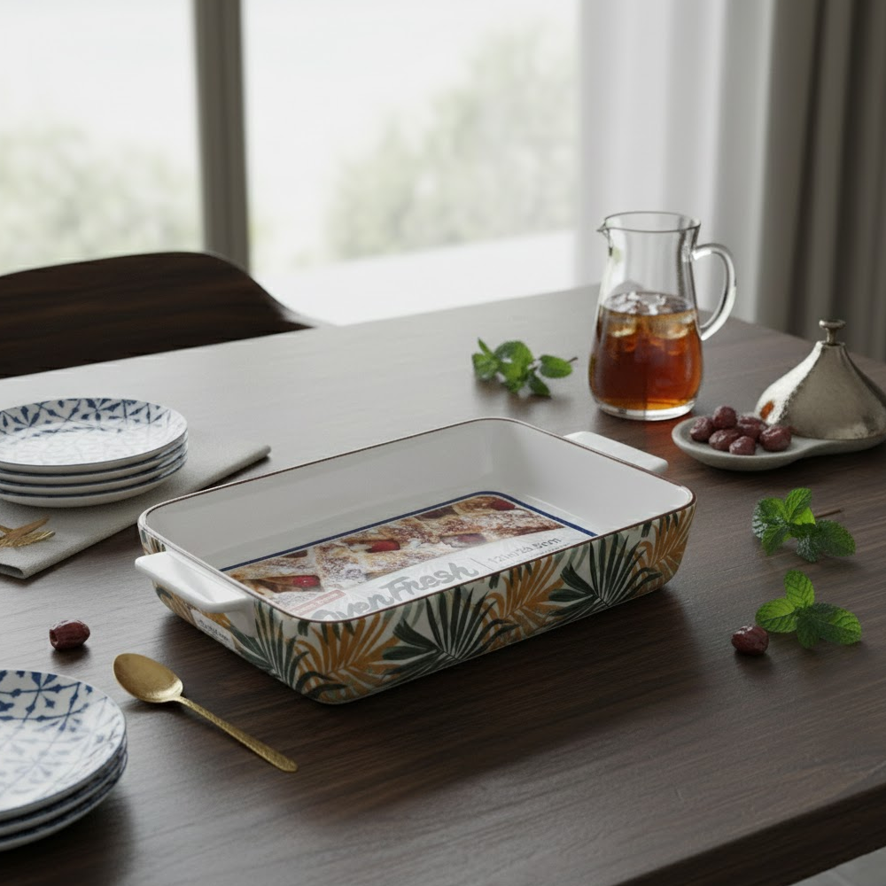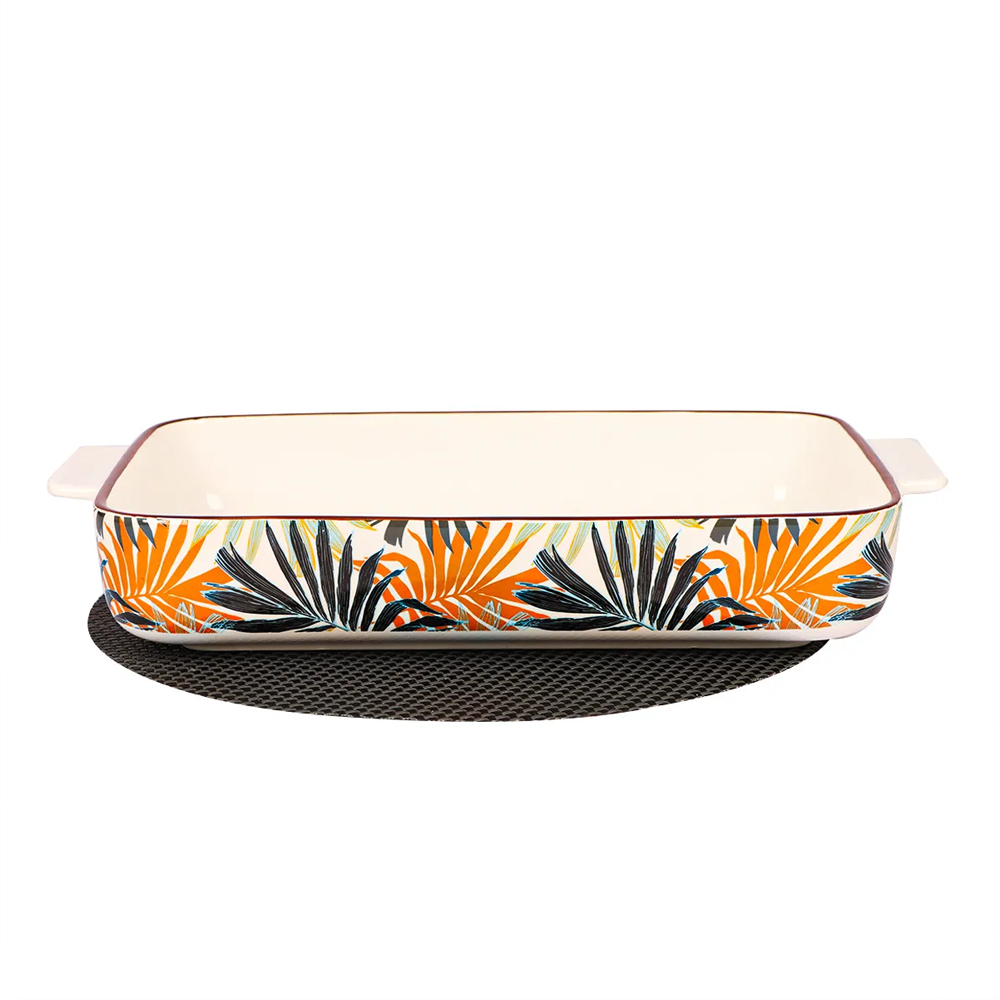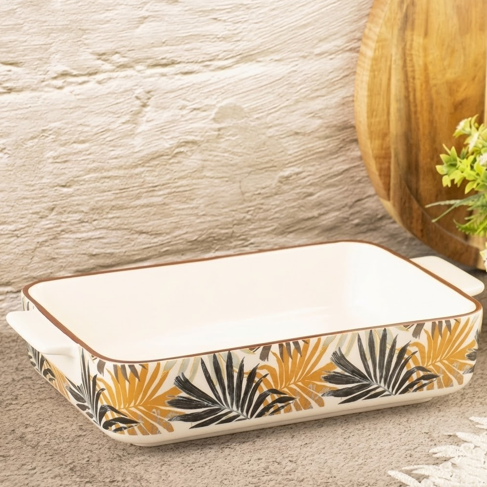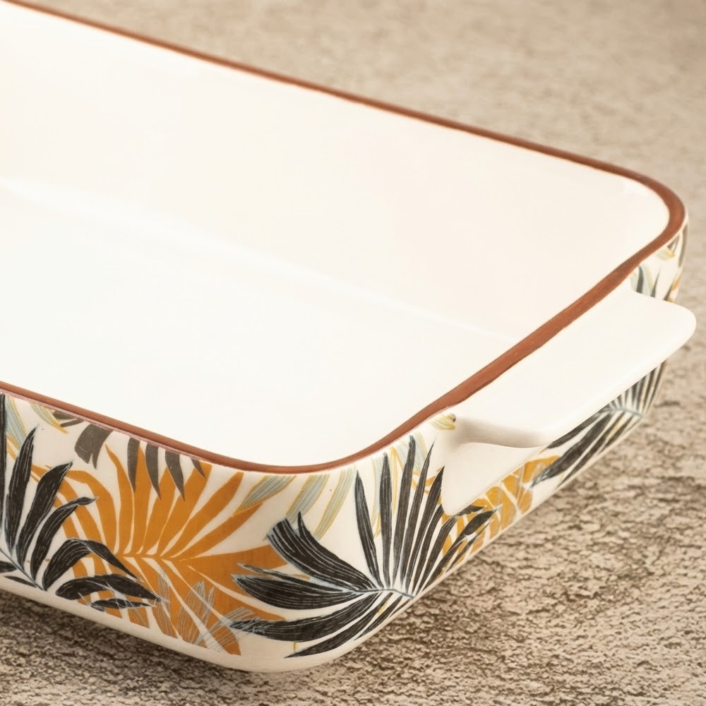 ارتقِ بتجربة الطهي والتقديم مع صينية الفرن السيراميك المستطيلة ذات التصميم المزخرف الأنيق المستوحى من الطبيعة.