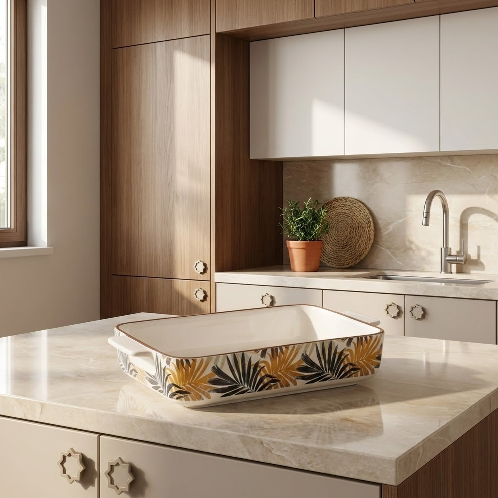 امنح مطبخك ولمائدتك لمسة أناقة دافئة مع طقم صواني الفرن السيراميك المزخرفة بنقشة الأوراق، المصمم ليجمع بين الجمال العصري والأداء العملي العالي. يتميز الطقم بألوان طبيعية هادئة ونقوش أوراق أنيقة مع حواف بنية راقية، مما يجعله مثاليًا للطهي والتقديم في آنٍ واحد.