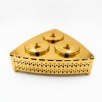 تتميز بثلاث أوعية دائرية مع أغطية معدنية أنيقة تحفظ الطعم والنكهة، ضمن قاعدة مثلثة التصميم بنقوش هندسية فاخرة تضيف لمسة جمالية لأي مجلس أو مائدة ضيافة.
