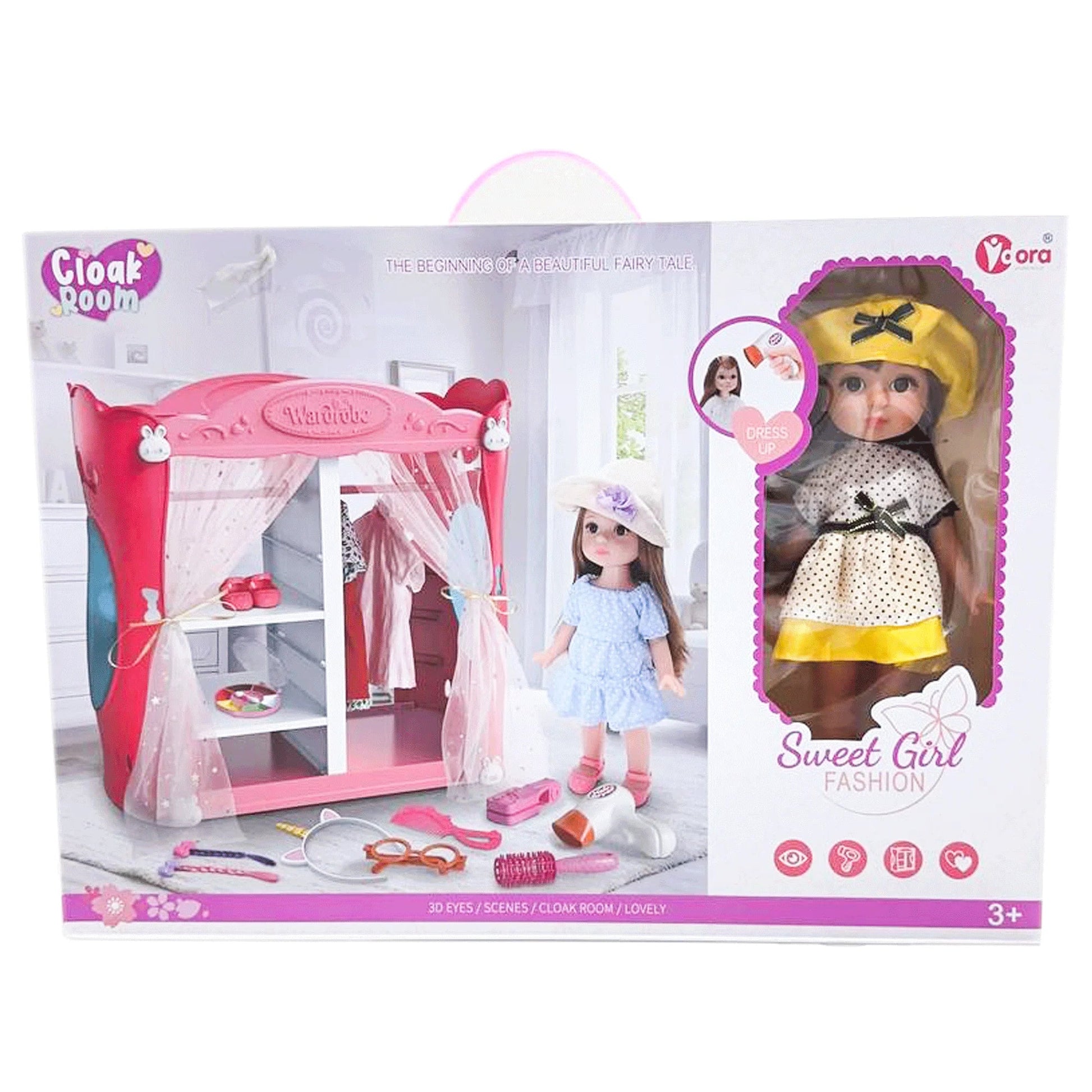 دمية أزياء الفتاة الحلوة مع خزانة ملابس وإكسسوارات – لعبة تلبيس وتخيل للبنات