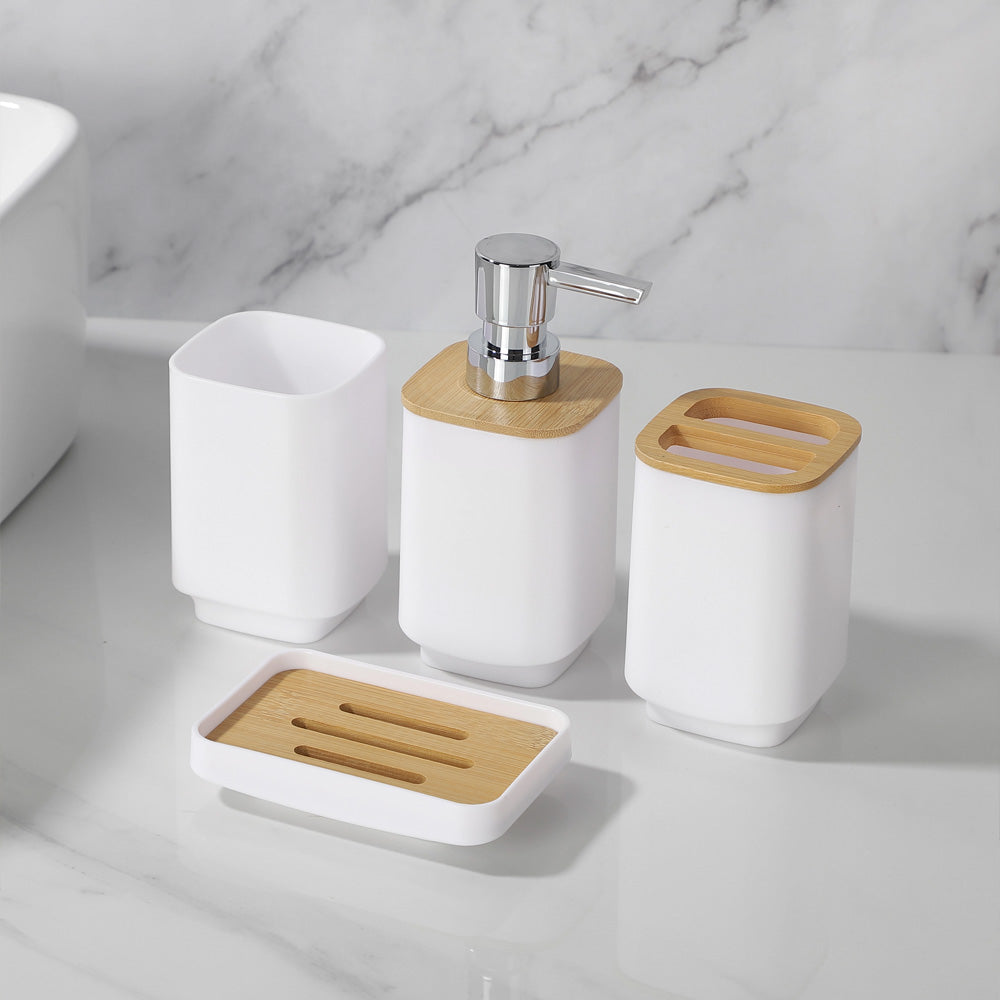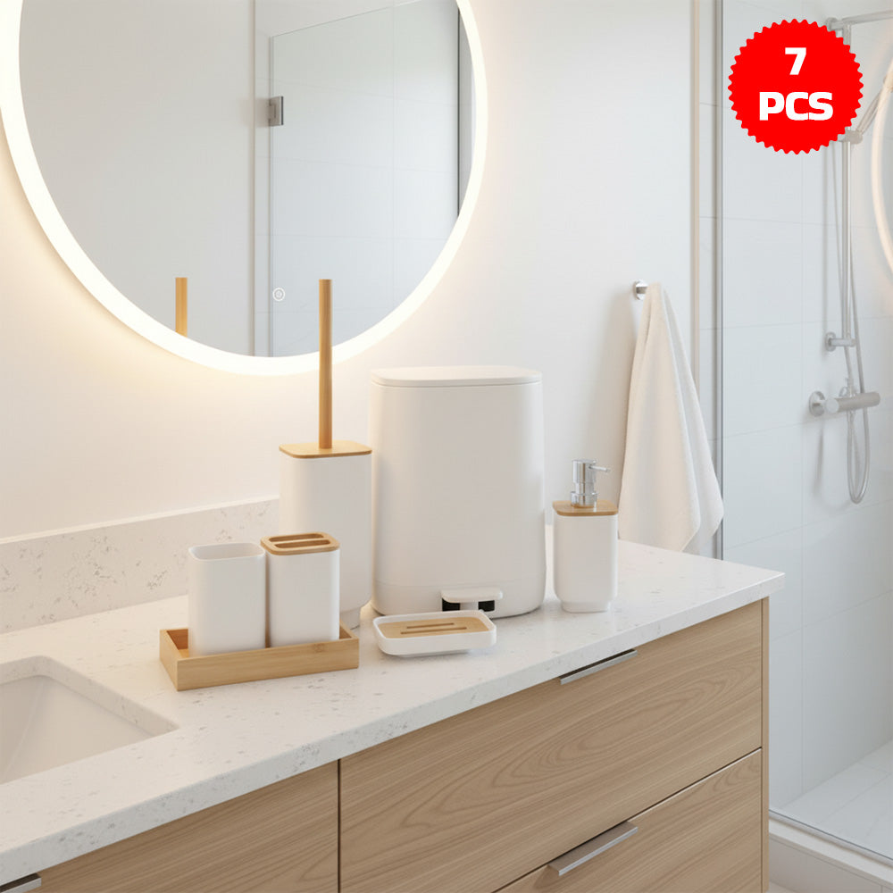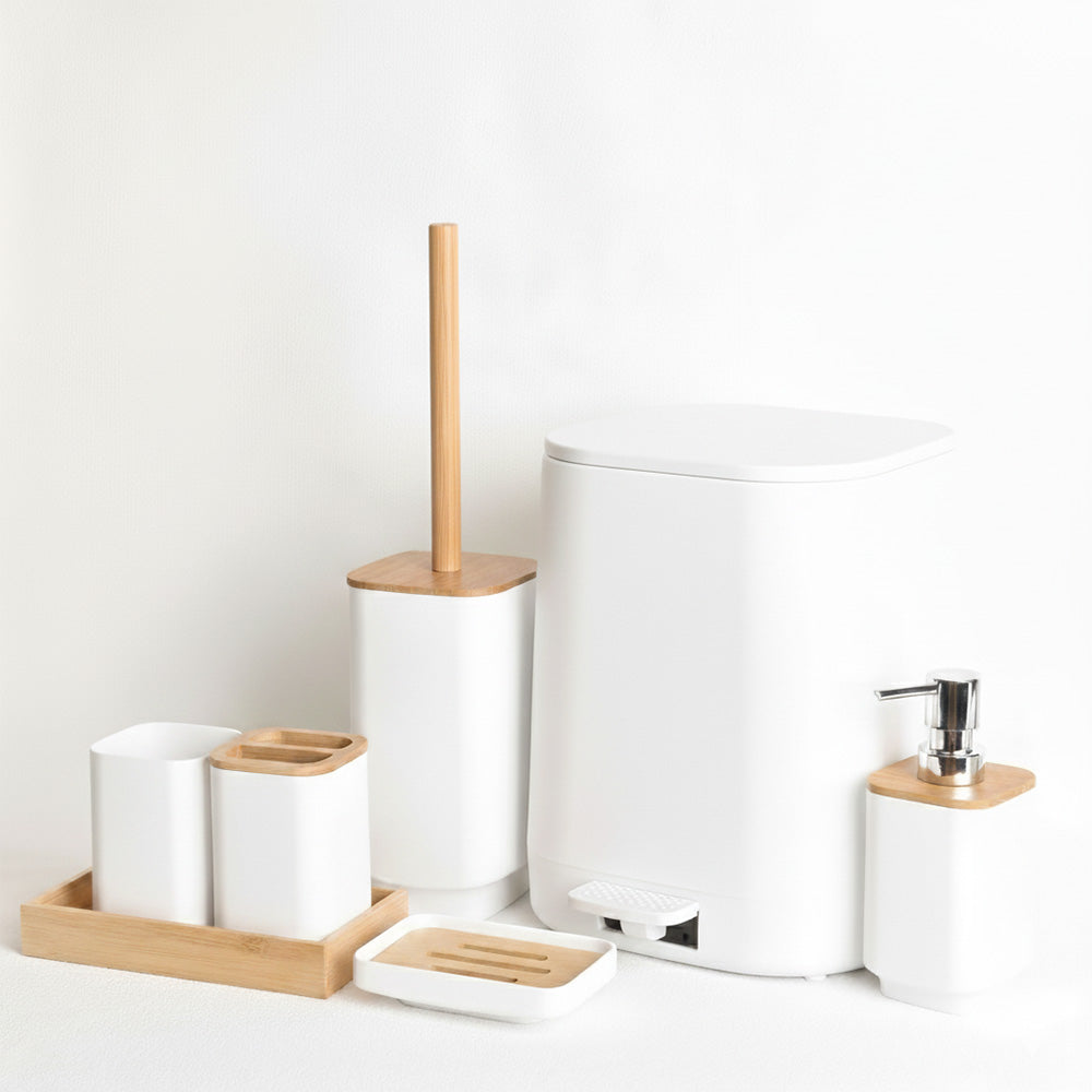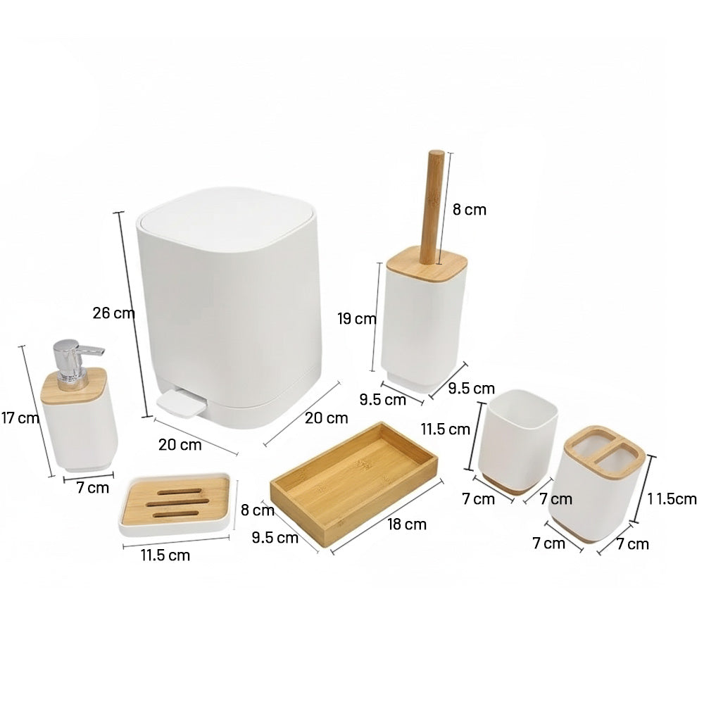 جدّد حمامك مع طقم إكسسوارات الحمام العصري هذا، المكون من 7 قطع، والمُصمم بلمسة نهائية بيضاء نقية ولمسات أنيقة من الخيزران. يشمل هذا الطقم جميع الضروريات - موزع صابون، حامل فرشاة أسنان، سلة مهملات، فرشاة حمام، صينية، وأكواب تخزين - مما يوفر لك عملية ومظهرًا أنيقًا ومتناسقًا. مثالي للمنازل والفنادق والحمامات العصرية.