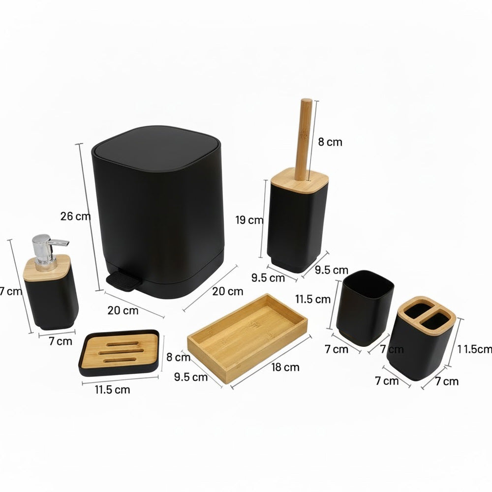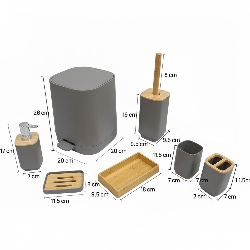 تتضمن هذه المجموعة الكاملة جميع الأدوات الأساسية - موزع صابون، حامل فرشاة أسنان، سلة مهملات، فرشاة مرحاض، صينية، وأكواب تخزين. تتضمن المجموعة: